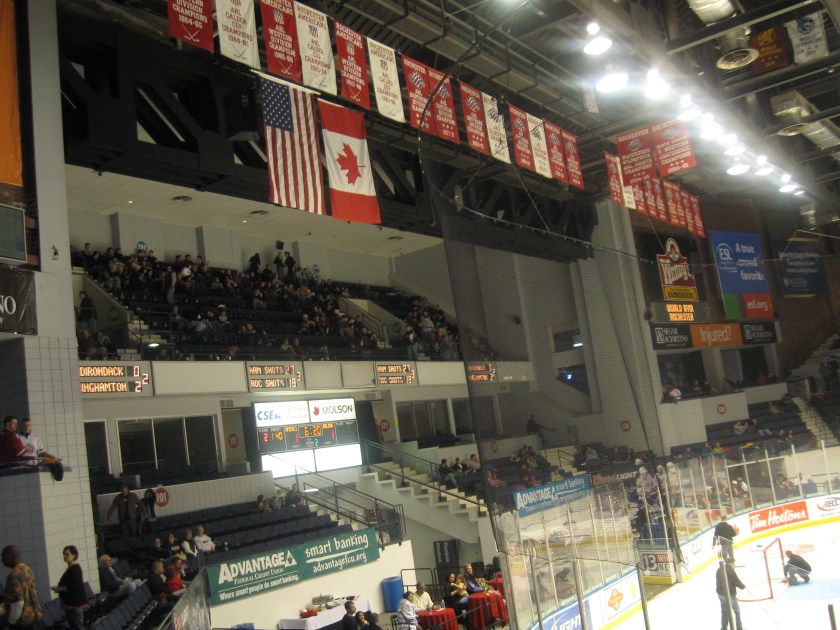 I hope everyone had a happy and safe holiday. We’re back from a brief break at work to see family and friends in Rochester and while there, we saw the AHL Amerks play Hamilton at Blue Cross Arena. The old barn otherwise known as the War Memorial (it’s former name) has to be considered my ‘home’ stadium. I’ve never taken the time to figure out how many games I’ve been to here, but it surely is a lot. It such a quirky arena with quite a contrast of old and new. The more hockey arenas I visit, the more I realize how special it is as so many of the other (mainly newer) arenas are just sterile. There are so many goofy traditions here that I love: The accordian guy playing tunes as you walk into the arena, how the lights have to be ‘warmed up’ because of their age while the anthem is playing, the Moose, the off-center scoreboard, the old horn and score-o between the first and second period.