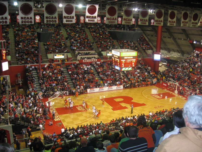Enough of me ranting and more to what you care about, the actual stadium! The traffic getting to the RAC was awful. The last time I went here, it was in a snowstorm, so traffic entering wasn’t an issue. According to my GPS, I was two minutes from my arrival at 6:55 PM. I pulled into my parking space at 7:20 PM (game time was 7:30 PM). Not good for an 8,000 seat arena. My second go-round here, really confirmed my thoughts that this is one ugly arena from the outside, and the seating inside is steep and goes on for a long time. However, it can be such a loud building and that’s what I like about it. There was only one time when the fans really got loud, but the noise was great. I really have to give a ton of credit to those Rutgers fans. They haven’t been to the NCAAs since 1991, almost always have a losing season, yet there they are, consistently filling the place and supporting the Knights. Those fans are a great group and deserve a great year to get the RAC rocking.