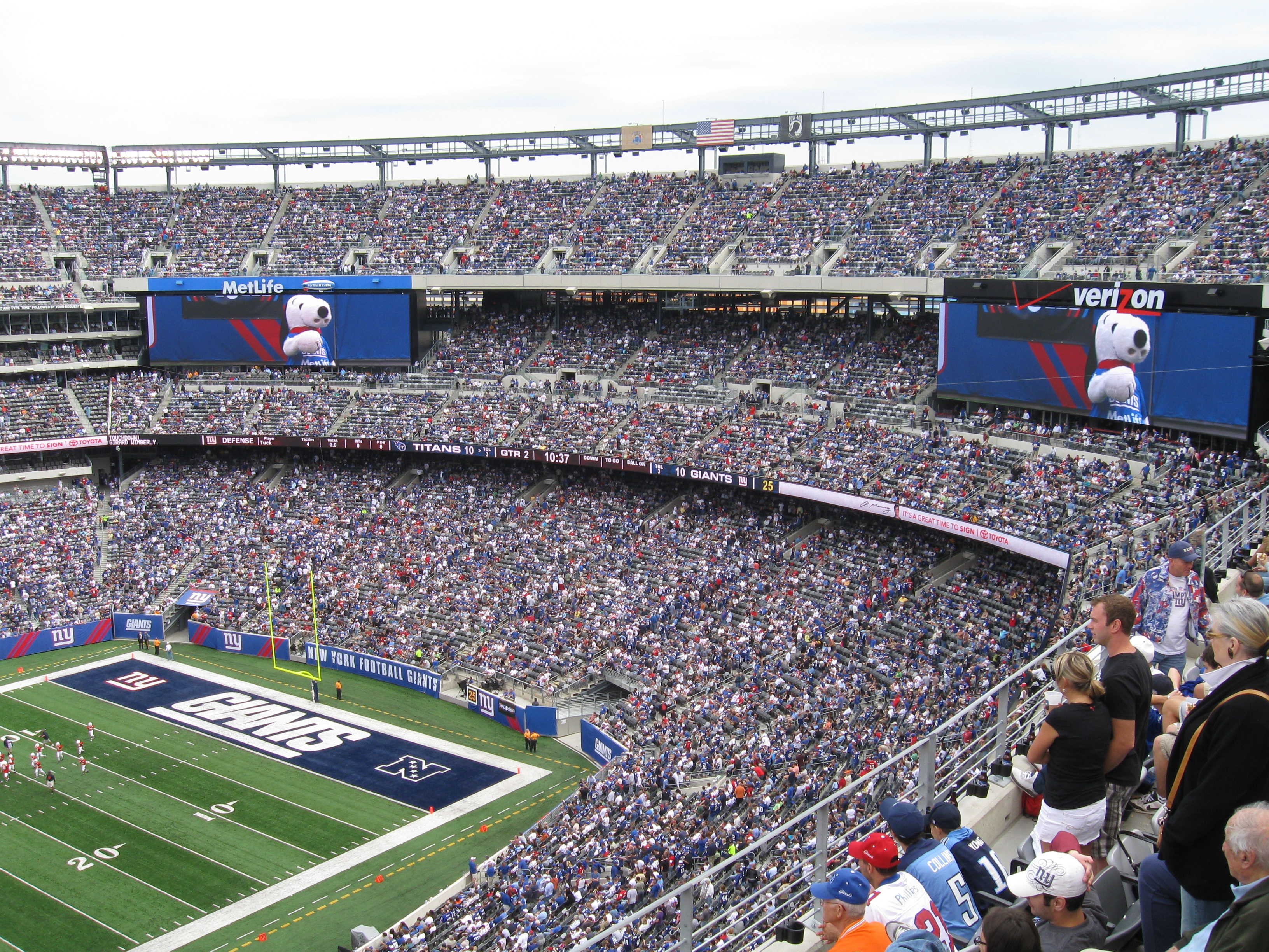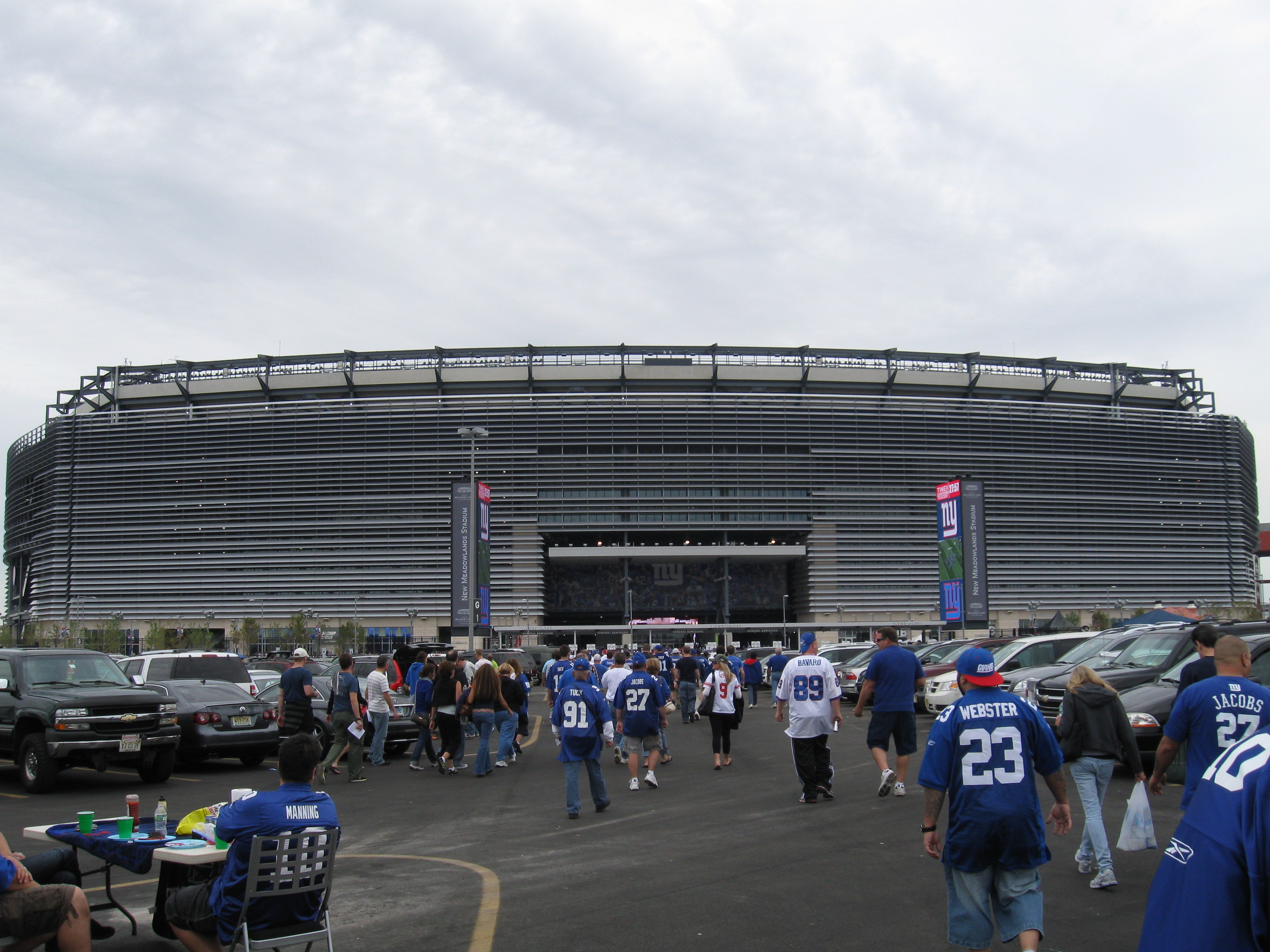 Last Thursday, I got a phone call from a friend who had a pair of tickets to the Giants-Titans game. I usually like to reserve judgement on new stadiums for a year or two…but you would be insane to pass this up. So it was off to the New Meadowlands Stadium in East Rutherford, NJ for only the second Giants regular-season game there. The first issue was how to get there. This “should” be a simple procedure, you drive to the Meadowlands Complex, which has 23,600 parking spaces and you tailgate or go to the game. Nope. Now, if you don’t have a parking pass, they won’t allow you into the Meadowlands to park. You’re directed to this odd area of four or five office complexes in Lyndhurst, where there are small lots. A bus shuttle then takes you to Lot P in the complex and then another shuttle comes and brings you to the stadium. You still have to fork over $25 for both areas. I don’t understand why they did this and when we got there we met up with a tailgate and talking to some of the people there, it seems not all season-ticket holders got parking passes. Really screwed up if you ask me. The one good thing I will say about the off-site parking is the traffic arriving was nearly non-existent and leaving was very easy too (we took Rt. 17 North to hook up with I-80). There are other transportation means (NJ Transit/train or a bus to the Port Authority in Manhattan), which have had some problems thus far, but I would think get ironed out soon. The tailgating scene around the stadium was pretty good and Giants fans seem like a nice crowd to hand around with.
