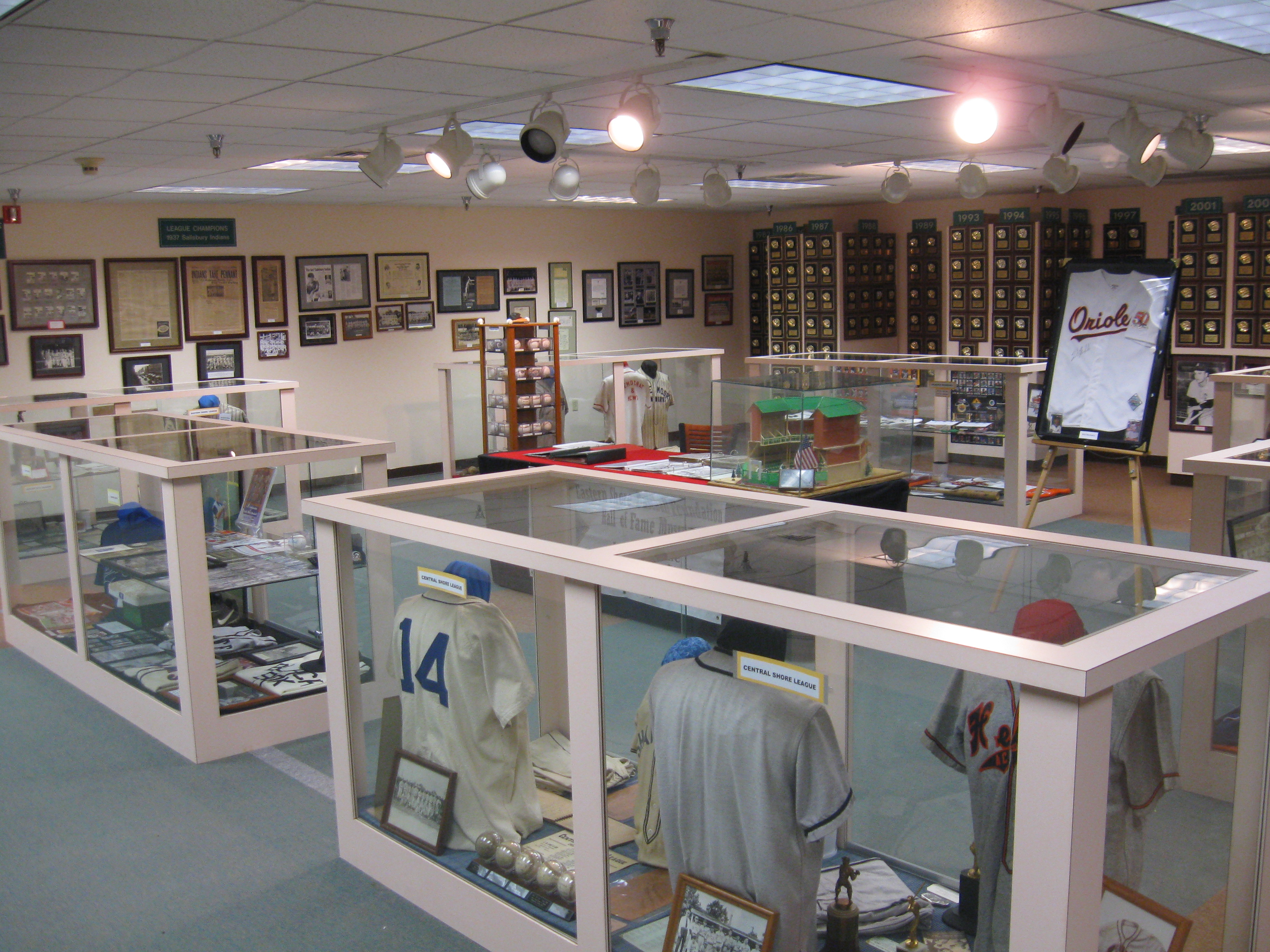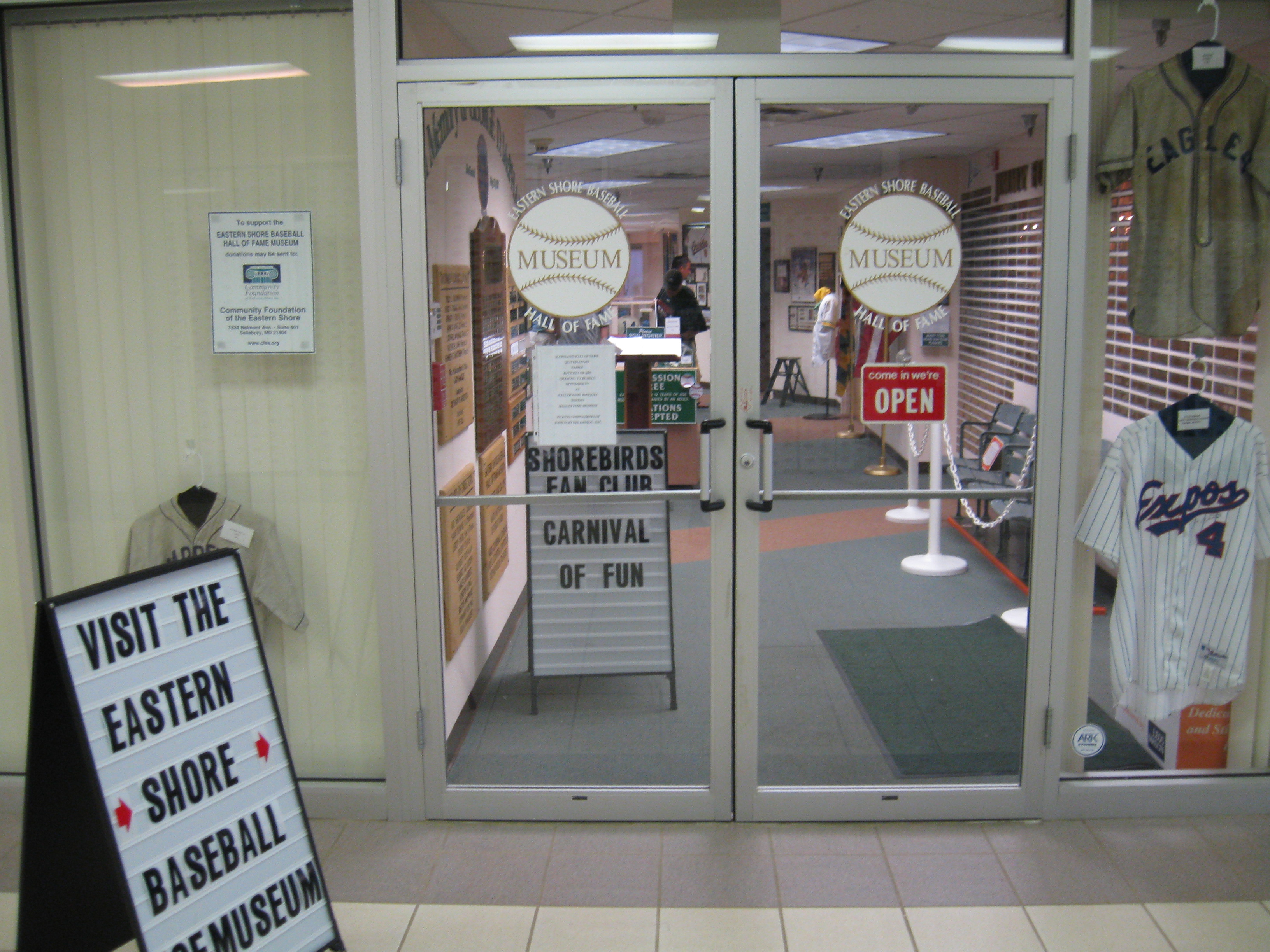 Our Memorial Day trip, started off by taking a ride through Delaware and into the DelMarVa, where we stopped at Salisbury, MD. This small city on the Eastern Shore of Maryland, didn’t offer too much, though we started at a free zoo which was descent for not having a charge. Dinner took us downtown to the Market Street Inn, right on the Wicomico River, where we had our best meal of the whole trip. Then it was off to the East side of town to check out Arthur W. Perdue Stadium and a South Atlantic League game between the Delmarva Shorebirds and the West Virginia Power. The best feature of this ballpark was the Eastern Shore Hall of Fame located in the hallway of the lower level. I wish I spent 45 minutes down here before the game instead of perusing in game, because what  a terrific hall of fame, the best I’ve seen so far at a minor league park. Most of the focus is on the Eastern Shore League in the early part of the 1900s, a league that compared to today’s “A” ball.  A wonderful collection of memorabilia from this era is displayed, including newspapers from when Salisbury won the ’37 league title. The man working there was also very knowledgeable and great to talk to as I learned that those Indians were one of the greatest minor league teams ever. Also displayed was the actual hall of fame and plaques for area players who played in the majors.