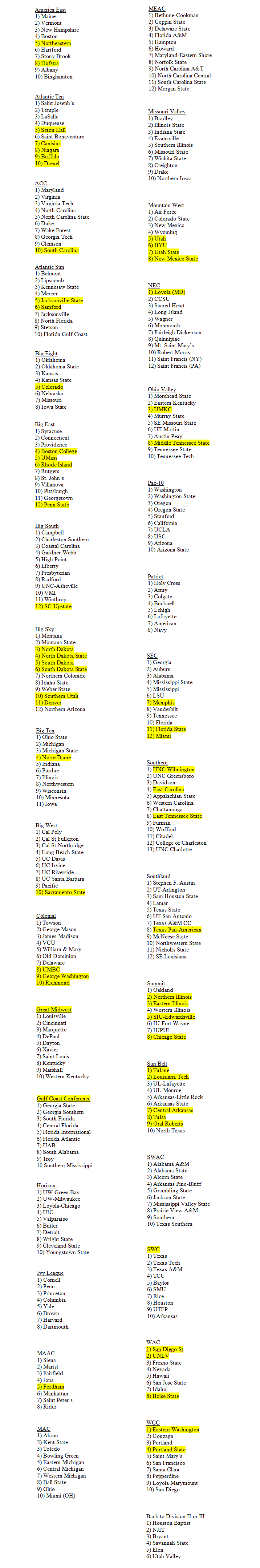 All the results are below, the highlighted teams are those that are in a new conference. Some stats…I made three new conferences: Great Midwest Conference, Gulf Coast Conference and Southwest Conference. Two of those are a blast from the past. Gone is Conference USA and the Great West Conference. Six conferences were good just the way they are: Horizon, Ivy, MEAC, Missouri Valley, NEC and SWAC. Six schools got sent back to Division II or III: Bryant, Elon, Houston Baptist, NJIT, Savannah State and Utah Valley. Only two conference have an unbalanced group of teams: Big Ten (11) and Southern (13). Twenty-five of the conferences allow for a balanced schedule.