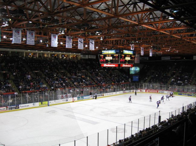 After walking around the city briefly, it was time for hockey in the BCVMA. I still felt like I was back in the 70s as the exterior and interior remains stuck in that era, especially with the reddish-orange color scheme. Despite the building’s shortcomings, I really like coming here to watch hockey as the sightlines on the side seating is excellent and the small, simplistic nature of the building really allows it to get loud. When I was here in 2004, it was sold-out and roaring…probably the best regular-season AHL atmosphere out of the nine buildings I’ve been to. But on this night, I was disappointed as only about 3/5ths of the building was full (announced crowd at 3,015). Like most places, Saturday Nights are better draws (the next night was 4,019, but thats still not a sellout), but even the people around me were commenting on the smallish crowd and it wasn’t as loud as it usually is. Being the worst team in the league this year may have a little to do with it, as a similar date last season drew a couple hundred more. Still, the atmosphere was decent, it just wasn’t at the awesome level I saw eight years ago. I’m sure the playoffs are fun here and the run to the 2011 Calder Cup must have been amazing. Check out the video below from a deafening BCVMA during Game 5 of the Finals: