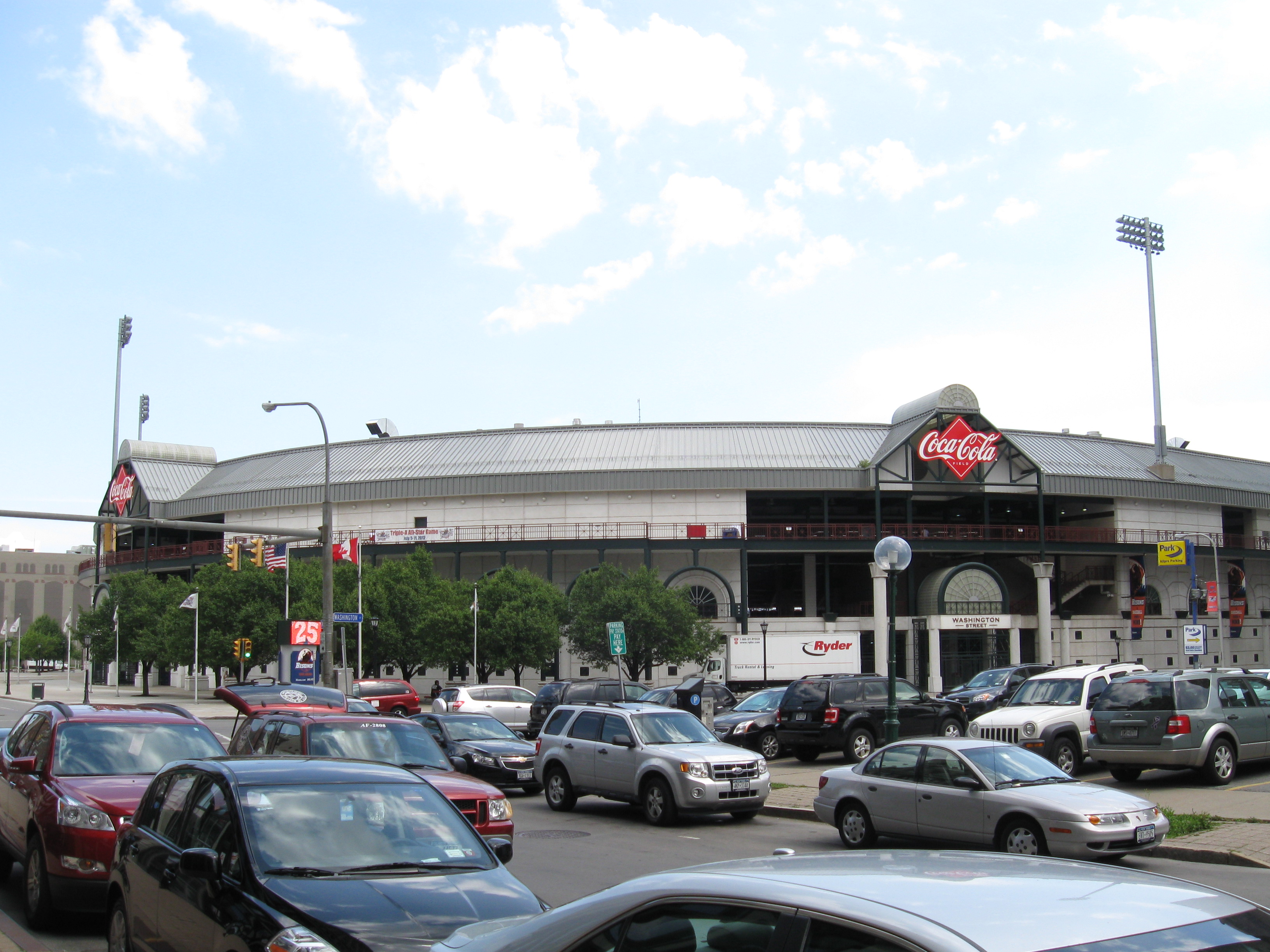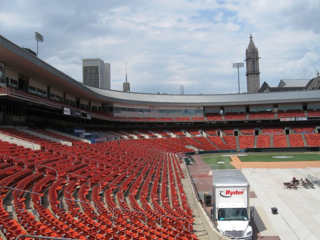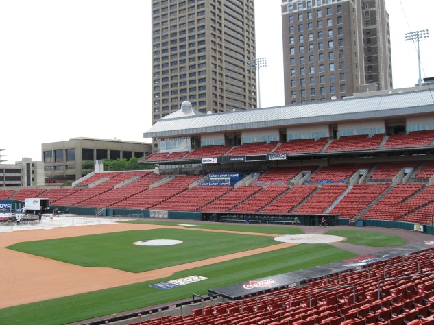 Over the last few days, I was up in Buffalo at a Symposium and Trade Show for work. We stayed right downtown near the convention center and on one of the days, I took the opportunity to walk around the city. Though I’ve been downtown for Sabres games many times, it has been almost ten years since my first and only visit to Coca-Cola Field, home of the Buffalo Bisons. This Triple A squad has played at Pilot Field, NorthAmericare Park, Dunn Tire Park, Coca-Cola Field for 25 seasons and is probably best known for it’s sheer size. At a capacity of 18,025, it is the largest in the minors. The ballpark is just up the road from the hockey arena and is within walking distance. I was just planning on getting some updated exterior pictures, but I noticed one of the gates open. So, in I walked and saw a wrestling crew working on a ring for an outdoor TNA show. Fully awaiting to get kicked out, I managed to walk around the stadium untouched to get pictures. I think this ballpark tends to get overlooked because of its age, but is a decent stadium. Below are some pictures. I also am going to update the review soon and it is in desperate need of repair as it was one of the first one’s I wrote. Check out Stadium Journey’s Coca Cola Field review as Buffalonian Andrew Kulyk really knows his stuff and does a terrific job breaking down the ballpark. As for my work on editing these reviews, I’m making limited progress on getting all of them cleaned up to the new format and rankings. Numbers 89 through 120 are done and then I’ve jumped around to reviews that made sense to update and got about ten or so done there. Still plenty of work to go and I’m thinking probably a year or two.