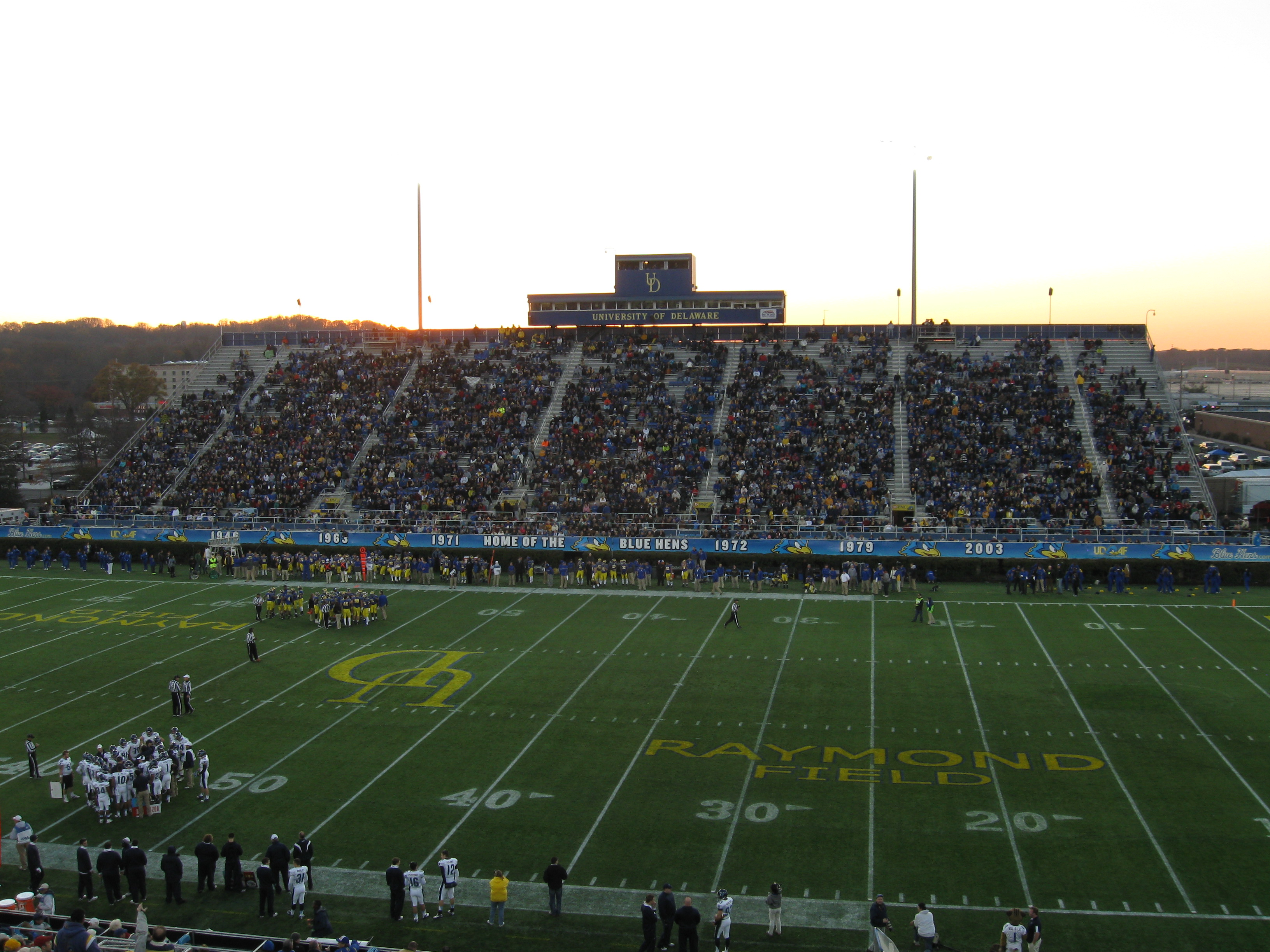 As for the stadium, there wasn’t much to get excited about as the bulk of the seating came on the sidelines where bleachers extended from end zone to end zone and went up a full 42 rows (which was quite a calf-tiring hike from the bottom). End seating featured a few short bleachers, which allowed for views of the other athletic facilities within the complex. Also nearby was a farmhouse, which explains the occasional wafting of manure that I smelled. Where the stadium did impress was it’s scoreboard and the several spots where Delaware displayed team and football accomplishments. This included huge murals on the exterior of the facility that showed old pictures and a “Wall of Champions” banner. The detailed review (#130 Delaware Stadium) has been updated and all of the details can be found there. Overall, a good trip and if the weather allows, I’m hoping to return to Newark for a visit to the basketball team and the Bob Carpenter Center on December 4th as the Hens take on Radford.