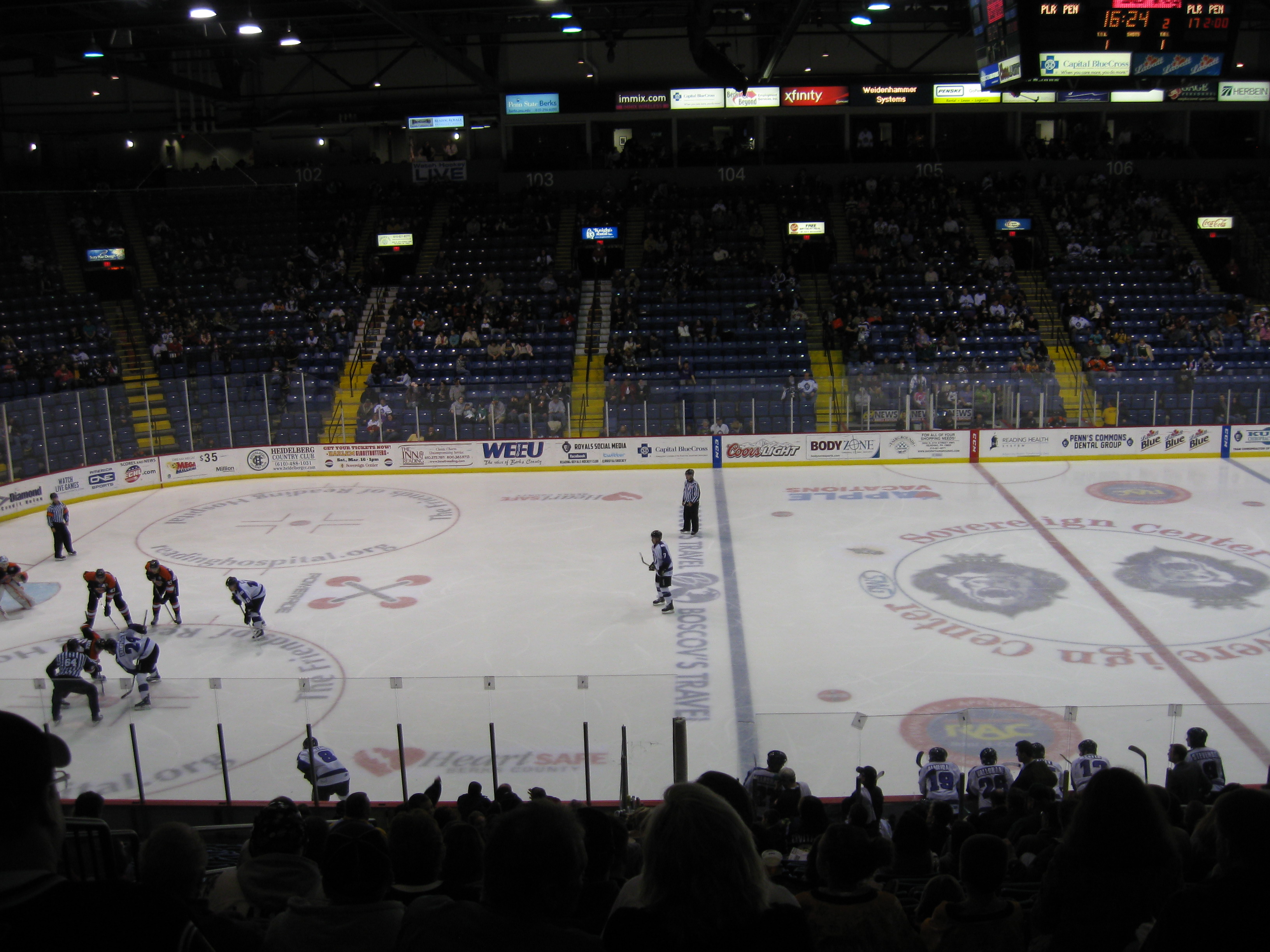 My trip to Reading came with two goals…one to get another take on their home arena and the other was to quench my thirst for some hockey. I left work on time early in the afternoon and made the two-hour trip west. My first visit in 2005 came at night, so I wanted to make sure I got some exterior shots of the Sovereign Center. The arena is right downtown and while driving thru Penn Street looks fine building-wise as a mid-sized city, this was kind of a scary place. There were plenty of people out when I was walking around taking pictures, but several were giving that uneasy vibe (loudly swearing, just generally acting like punks). Walking around the vicinity of the arena is fine for games, but I don’t think I would venture much beyond there.