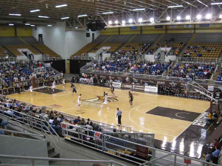 I’ve been itching to get back to Stabler Arena for a while to fix some blurry pictures, compile a Stadium Journey review and check out a Mountain Hawk team that I really liked even without CJ McCollum in the lineup. Wednesday presented that opportunity as I zipped on over to Bethlehem after work to arrive a minute into their Patriot League game against Navy. Stabler is much more of an arena than gym, when you compare it to the rest of the facilities in the Patriot. It’s not a bad place; conveniently accessible and spacious inside. The set-up is a little boxy and it’s annoying how the ends and sides don’t connect. But it’s a more comfortable facility to watch a game than their rivals down the road in Lafayette. My last time there in 2008, I was surprised at how ridiculously empty it was. Their conference tournament quarterfinal game against Army only had maybe 500-800 fans, hardly any of them students. This time, it was good to see a better crowd on hand (1200) with more students. They were a little more engaging too. A lot of this could be bandwagoners from last year’s historical team that beat Duke, so it will be interesting to see if fans keep their interest in a couple years.