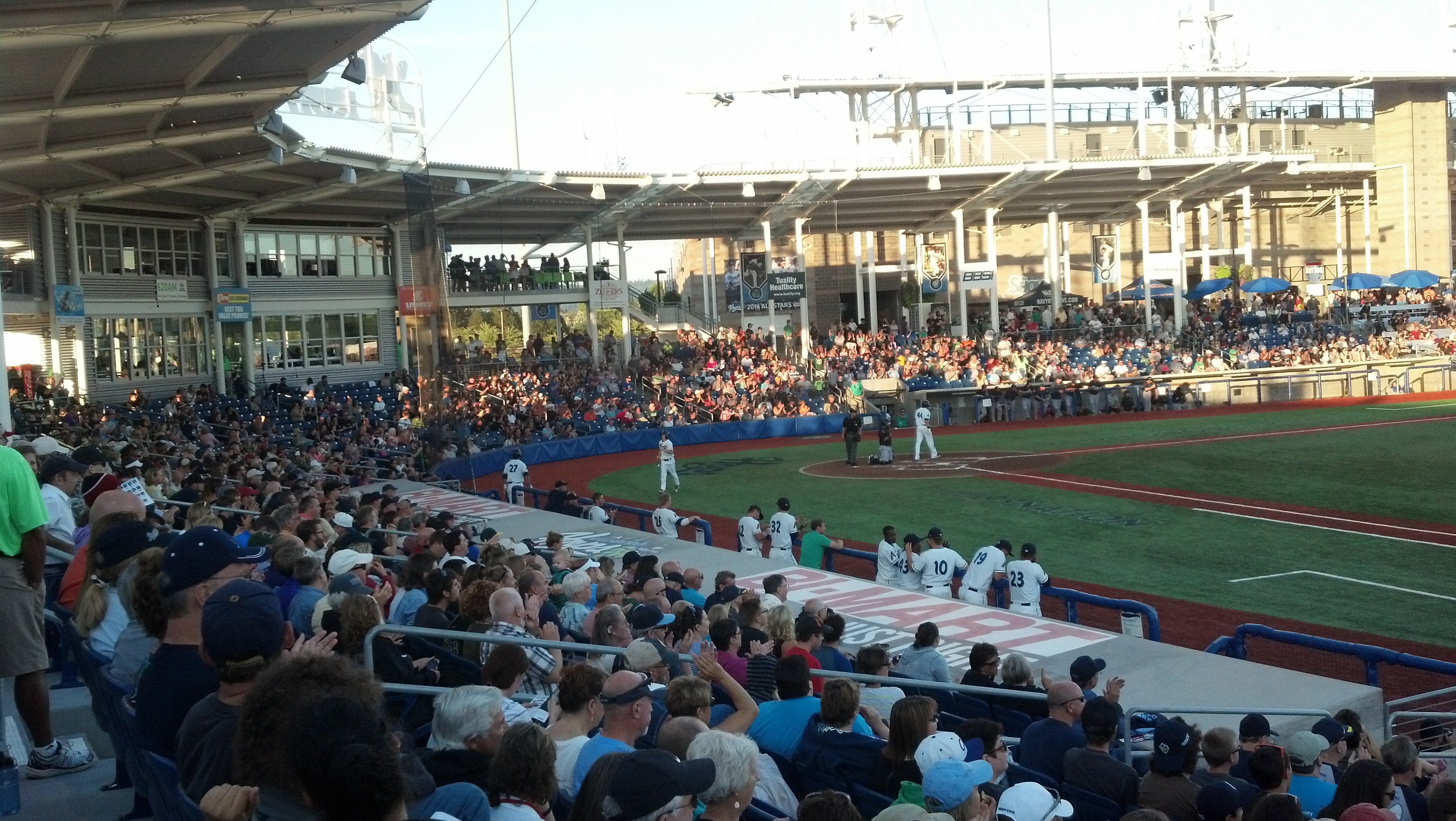 Volcanoes Stadium is about 15 minutes away from Salem, in the town of Keiser. What a crappy ballpark. First, boo to their front office and way overpricing tickets (plus telling people that the 200 level seats were ‘sold out’ and just $20 seats or grassy areas were available). The design is terrible with a huge walkway behind home plate and a mostly bleachered ballpark set far from the field with lots of foul territory. Other negatives include the view of I-5, sun-weathered seats changing the color to pink and splintered picnic tables on the left-field line. I’m definitely not a fan of this place and I’m shocked it was built in 1997. The game took forever too (3:20), but the home team prevailed with a 9-5 win. Not all of the parks will be great and that keeps things interesting.