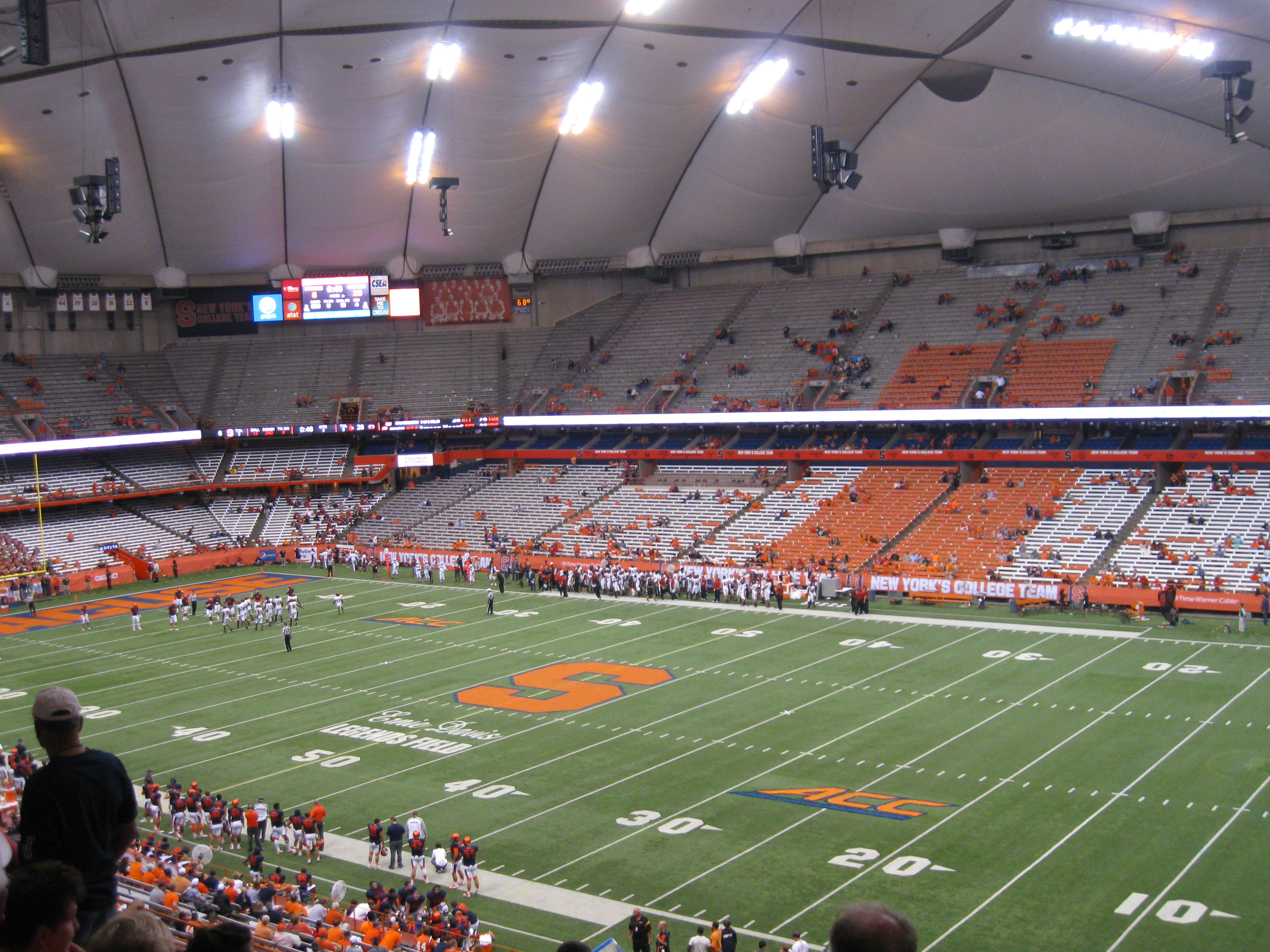 I made my way towards the Carrier Dome pretty early for picture purposes and that means taking a shuttle bus from the Skytop parking area. Given that it was a Friday, tailgating was limited and I was one of only a few people on the bus at 5 PM for a game starting at 7. If one is not familiar with the area, it can be a little confusing as the shuttle also acts as a regular college transportation system and the Dome is not visible from the drop-off point. Usually first-timers can just follow the crowd, but this was not the case just yet. I spent a little time around with the diverse campus and I always loved how the Dome is right in the middle of it. However, I can never get a decent exterior shot and the surrounding hillside exhausted my efforts to find a good shot. After passing through the revolving doors and feeling that suction of air, I made a couple passes around the generally dank concourses. There are pictures on the walls to help liven things up a bit and it wasn’t until the very end that I found a few display cases worth perusing. Food remarkably remains terrible with practically every stand selling the same worn options of Hoffman’s Sausage Subs or German Franks. The beer on the other hand is flowing with different options all over (keep in mind, this is a rare on-campus facility to offer beer). I still love the Carrier Dome as a football stadium with the seating being intimate and the design decent. While the bleachers may be uncomfortable, pretty much anywhere offers a fine sightline. They don’t call this place the Loud House for nothing and the enclosed Dome setting makes it roar. I’ve been to Wisconsin, Penn State and Notre Dame and when it comes noise, I think Syracuse is loudest with less than half of the fans. This ACC opener only featured a stadium about 3/5ths full, but it was still very noisy, especially as everyone got up on third downs. Just imagine if the program did get back to prominence. The game was a sloppy affair as both turnovers and penalties hurt the Orange. A bad play call gave Louisville a safety in the first half and then poor clock management by QB Terrel Hunt led to time running out at the end of the first half as Syracuse was one yard from the end zone. The second half was not much better as a wide-open Jarrod West dropped a gimme touchdown. Louisville added on more (including another safety) and they won 28-6 as the Dome was empty with a minute left in the game. It was a fun event as I met up with my college roommate and friends and we finished the night by tailgating after the game. Ah the good ol’ days.