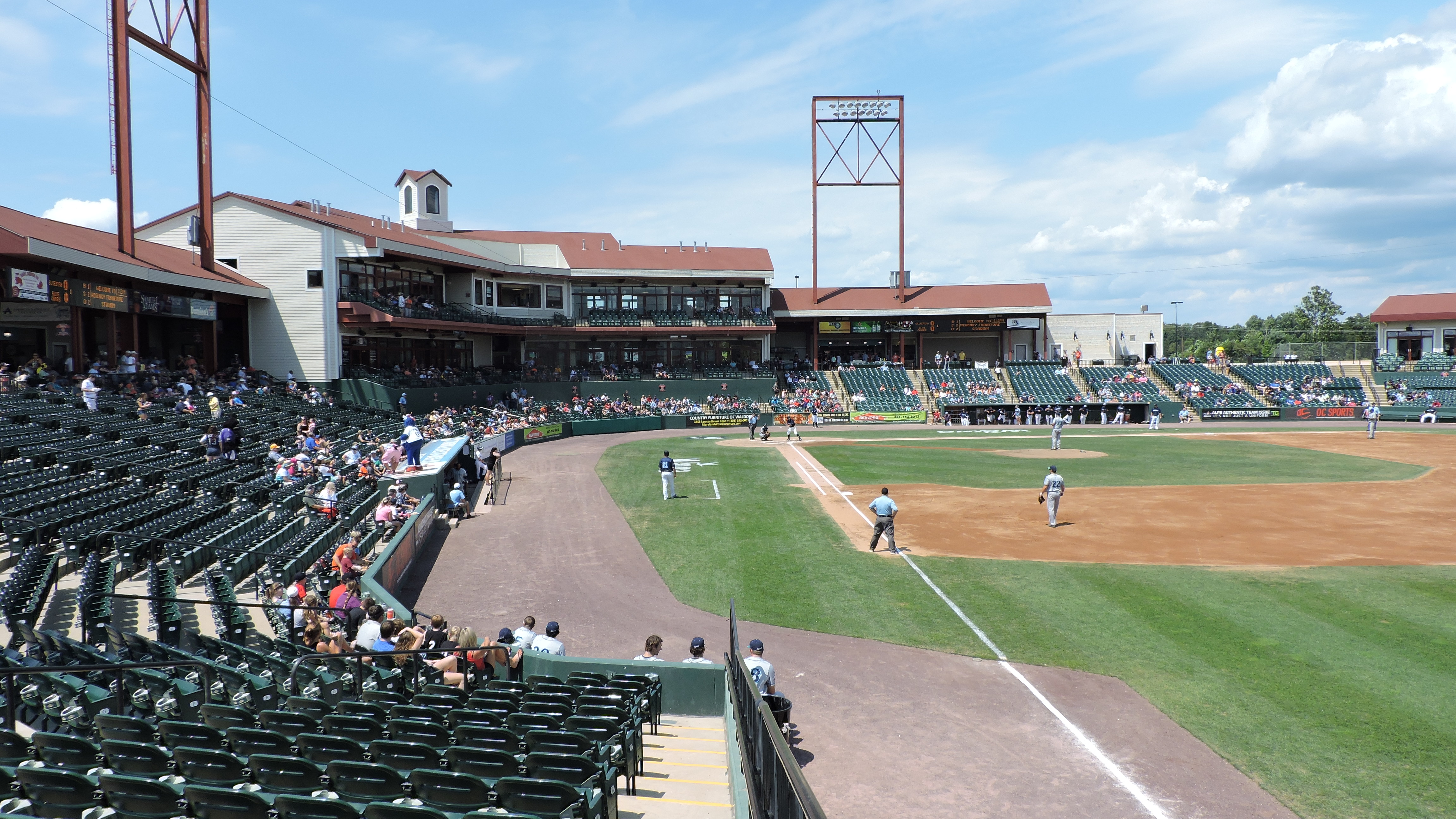 The town of Waldorf is not exactly historic however as the center is a six-lane road that is a national chain store paradise. Go ahead, think of a big-box retailer or a nationalized restaurant and I bet it is in one of the side strip malls lining this road. Not my cup of tea, but it serves this booming area 30 miles southeast of DC. Housing is exploding in the area and that is evident on the drive to Regency Furniture Stadium. The vast parking lot in front of the park leads to a refreshingly different exterior design, which actually resembles a house with its beige siding and red panel roof. Given that this is the Atlantic League and their ballparks are so darn similar, I was expecting more of the same. Instead, I was blown away by such a terrific set-up. Check it out in the picture above as I love how the seats turn inward towards home plate (though you better watch every pitch). I even like the partially enclosed concourse behind home plate as it is not necessary to have the walkway 100% open to the field. The Blue Crabs have a great thing going on with an excellent park, though other aspects could be a little better, like the underwhelming food selection. Also, as unpopular an opinion this may be, I found the on-field MC Ron Lord (the tye-dye guy) to be incredibly annoying. He constantly was getting in the way of watching the game, whether it was standing on the dugout during action or his interrupting comments, I moved seats a few times just to get away. Even while the Blue Crabs were in a decisive moment in the 10th inning, he was loudly spewing some non-sense unrelated to the game. From a neutral perspective, his interactions with the fans were awkward too. While he drove me nuts, I was certainly in the minority as the crowd loved him. As for the game, it was a battle of blue ocean creatures as the Bridgeport Bluefish took on the Southern Maryland Blue Crabs. The visitors built a 3-0 lead, but to the delight of the home fans, a Gustavo Molina blast tied the game in the 6th inning. Despite only six runs scored, the game past the 3 hour mark before going to extra innings (note to baseball at all levels: you need to fix 9-inning games that go longer than 3 hours!). We went to the 10th, where a Bridgeport run was answered by Southern Maryland in the bottom half. Casey Frawley was inches from winning the game, but his long shot hit the top of the wall and only one run scored. The Bluefish finally put the game away in the 11th and won 5-4. The trip home was thankfully pleasant as I took a route that avoided all traffic and tolls, getting back to NW NJ in less than five hours. Look for official reviews on the right-side of the page by next week.