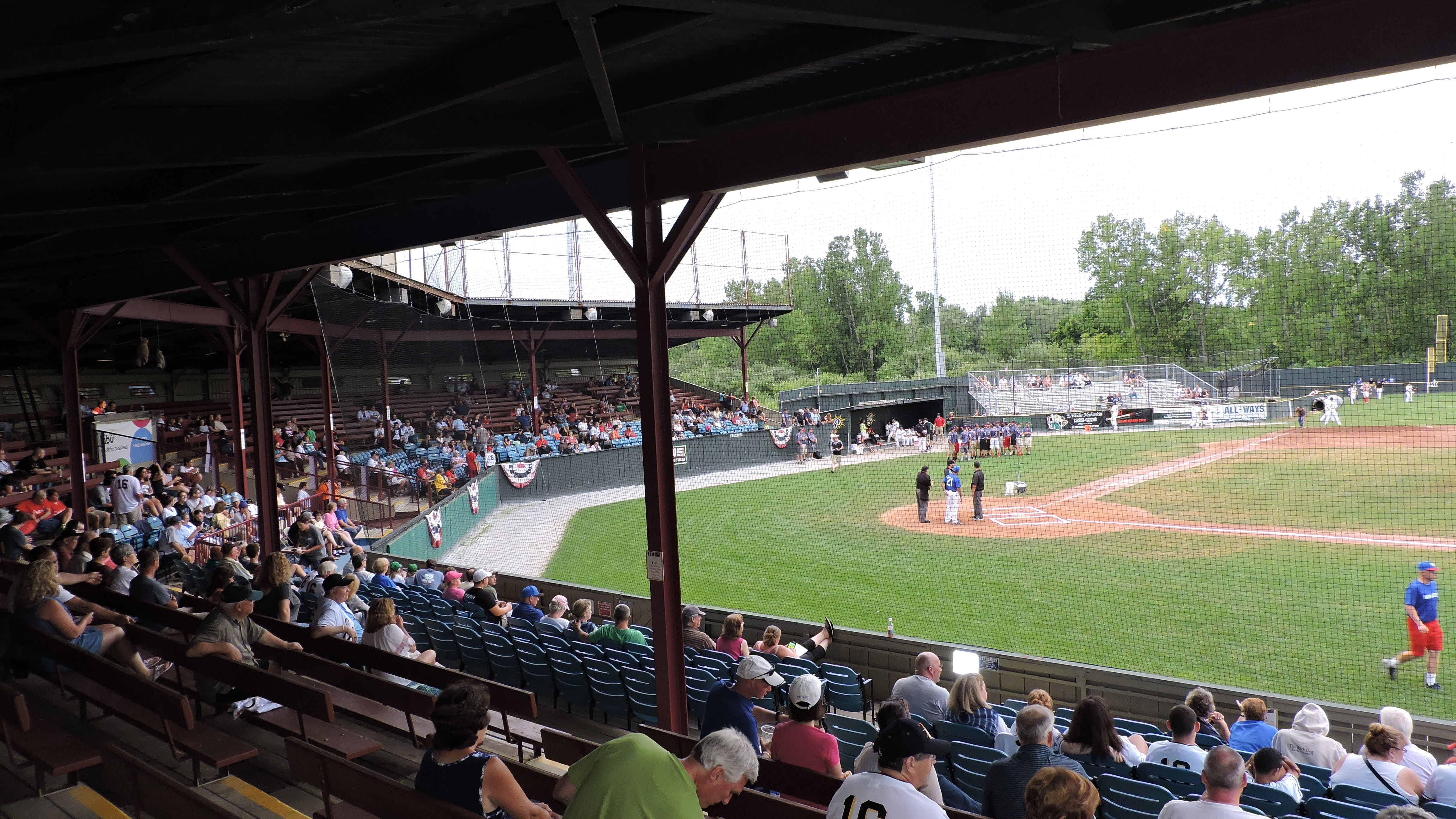 Wahconah Park was built in 1919 and is one of the last remaining ballparks with a wooden grandstand. This is a stadium that oozes likability from purists. It was an auspicious start though as the parking situation in the dirt parking lot is cramped and poor, then I had to wait 15 minutes in a slow-moving line to get my ticket. The generic siding on the exterior, then gave way to the excellent experience I was expecting as I walked up the wonderful ramp behind home plate and into a charming ballpark that has stood the test of time. The wooden grandstand is what you would anticipate from that era as it is covered and held by support beams. Complementing the ballpark is a game experience reduced in theatrics. Just one between-inning contest and lots of organ music greeted a pleasant game that steps back in time. The contest was a FCBL one between the Suns and North Shore Navigators, who had uniforms like a junior high team. North Shore belted three solo home runs to bring a 3-0 lead into the 9th, but Pittsfield staged a rally in their last at-bat. Shaky closing pitching and defense gave up 2 runs with 2 outs and Pittsfield had the tying run at 3rd and the winning run at 2nd. However, Quinn DiPasquale struck out Al Zachary as North Shore hung on to win. That finish was played in a light rain and I would make a wet drive to the hotel. Not something I wanted to do on winding, two-lane Route 20 as insane hotel prices in the Pittsfield area led me to save a hundred bucks or so by driving 40 min to a place in East Greenbush, NY. I knew that the Berkshires were a popular summer spot for New Englanders, but is it that much where a Hampton Inn costs $330 on a weekend. Outrageous!