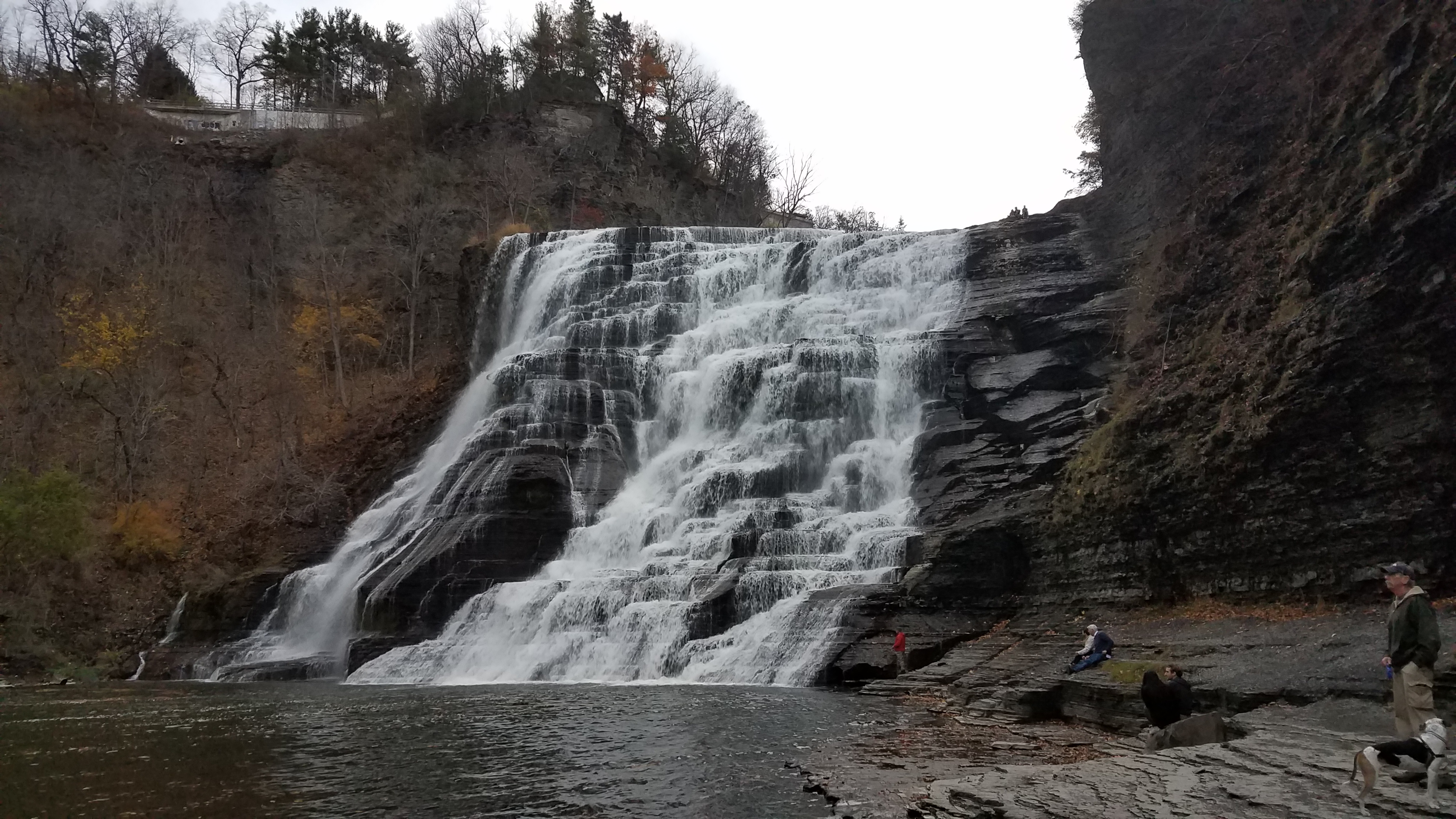 I’ve yet to walk thru much of Cornell’s campus, so seeing that this was not an official stadium visit and the game was well in hand, I headed out a bit early for another stroll. The grounds at Cornell are terrific and I particularly loved the central part of campus that included McGraw Tower, Uris Library and plenty of historical buildings with a few statues. Even better is the proximity to another gorge as the suspension bridge over Falls Creek is a must see. About this time, the temperature dropped 10 degrees as a cold front passed and the winds picked up…a quick reminder of the challenge ahead of me at the end of the journey. I hustled back to the car for one more stop before downtown. This one was to see Ithaca Falls, an amazing waterfall where I would have loved to relax at for more than a few minutes. I then drove into the center of Ithaca via their wacky, hilly streets and grabbed dinner at Red’s Place, one of many decent options.