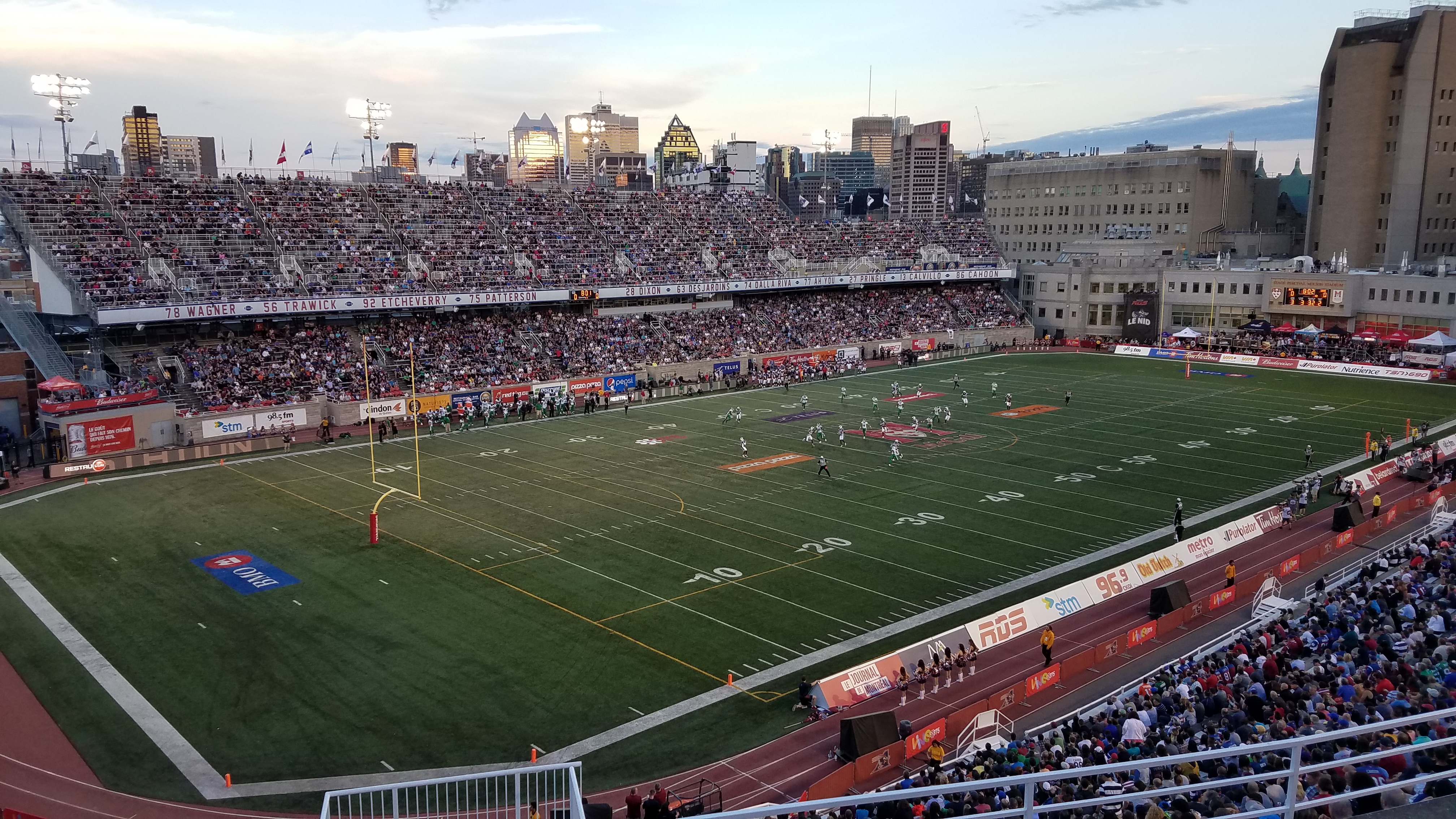 The crowd was lively and it was festive atmosphere throughout as there was a lot of singing and dancing with the music on the PA. The wave made an appearance as well. I am new to the CFL and for those not familiar, the primary differences from the American game are: Three Downs (instead of 4), goal posts at the front of a larger endzone, 1 point if a kicked ball is not returned from the endzone and orange penalty flags. I had a hard time getting used to the 3 downs and it really slowed the game down. It took awhile for a score as it was not until late in the 2nd when Montreal got on the board thanks to a 65 yard pass from Darian Durant, the former QB of their opponent Saskatchewan. The game got good at the end and the Al’s took the lead with an 18-yard field goal with just under 3 minutes remaining. The Riders drove back down and did what drives me nuts in all levels of football…settle for a mid-long range field goal. They easily could have ran 2-3 more plays, but instead, let the clock run down to attempt a 45 yard field goal. I was glad to see them punished as it missed and Montreal was victorious, ending a great stadium visit. Look for a detailed stadium review next week.