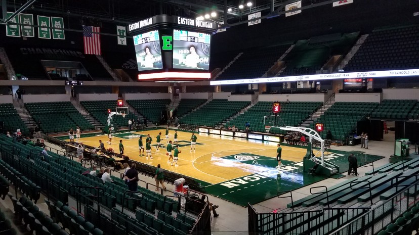 On Sunday, I spent the morning doing work-related stuff before heading to Ypsilanti. With rain falling and the thermometer nervously flirting with 32, I was thankful not to find any ice and that the temperature gradually climbed through the day. The Convocation Center was the destination as Eastern Michigan basketball took on Michigan, Dearborn that is. A non-D1 school is not out of the ordinary for the Eagles as they play around four per season. Their arena is a nice building, one of the best in the MAC. The spacious lobby a nice welcome and the interior is designed well for basketball. They have a beautiful scoreboard too. Unfortunately, not many see it as I counted about 350 in attendance and that’s not far from the norm as the team usually is last in league attendance. The Eagles predictably won, but it was an entertaining affair that had good pace. Final score: 97-73 over the Wolverines. I know their part of the UM system, but why can’t Dearborn use their own nickname and logo?