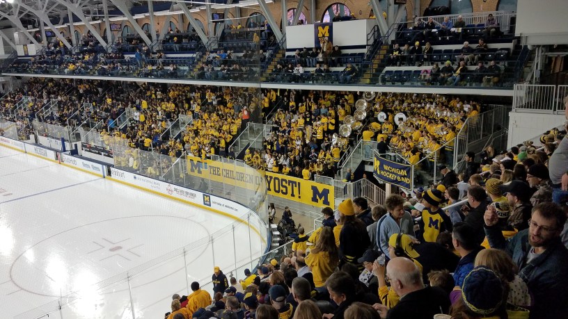 Yost is a historic old building evidenced on the outside by the brick facade and field house appearance. Inside, the renovations are obvious as the concourse displays and center scoreboard are most notable in regards to updates. The seating is awkward in that overhanging club sections make for a closed and almost obstructed appearance for the back four rows on each side. The design is such that each side has flat seating, so the corners are not a desireable place to sit. The inside does not do the exterior appearance justice and that’s because this is not an original hockey rink as it was retrofitted to become one in the 70s. What makes Yost special is the atmosphere thanks to the students and band. They were both phenomenal and made for a really fun place to watch a game. There are only a handful of stadiums that I have been to where I left craving more and thinking about the game for days after. This was one of them. Their “Sieve” chant is terrific and so is their originality, evident by the 10-year-old kid who joined them after the students went bonkers as he obeyed their request by taking his socks off on the zamboni ride. And that band! My opinion they have the best three-song combo in the country (Hail to the Victors, Lets Go Blue and Can’t Turn You Loose). The game was phenomenal as well after things looked bleak when Minnesota grabbed a 3-0 lead in the second period. The Wolverines came back and the game went to OT before Michigan’s Alex Roos put home the winner. Great experience that lived up to my lofty expectations.