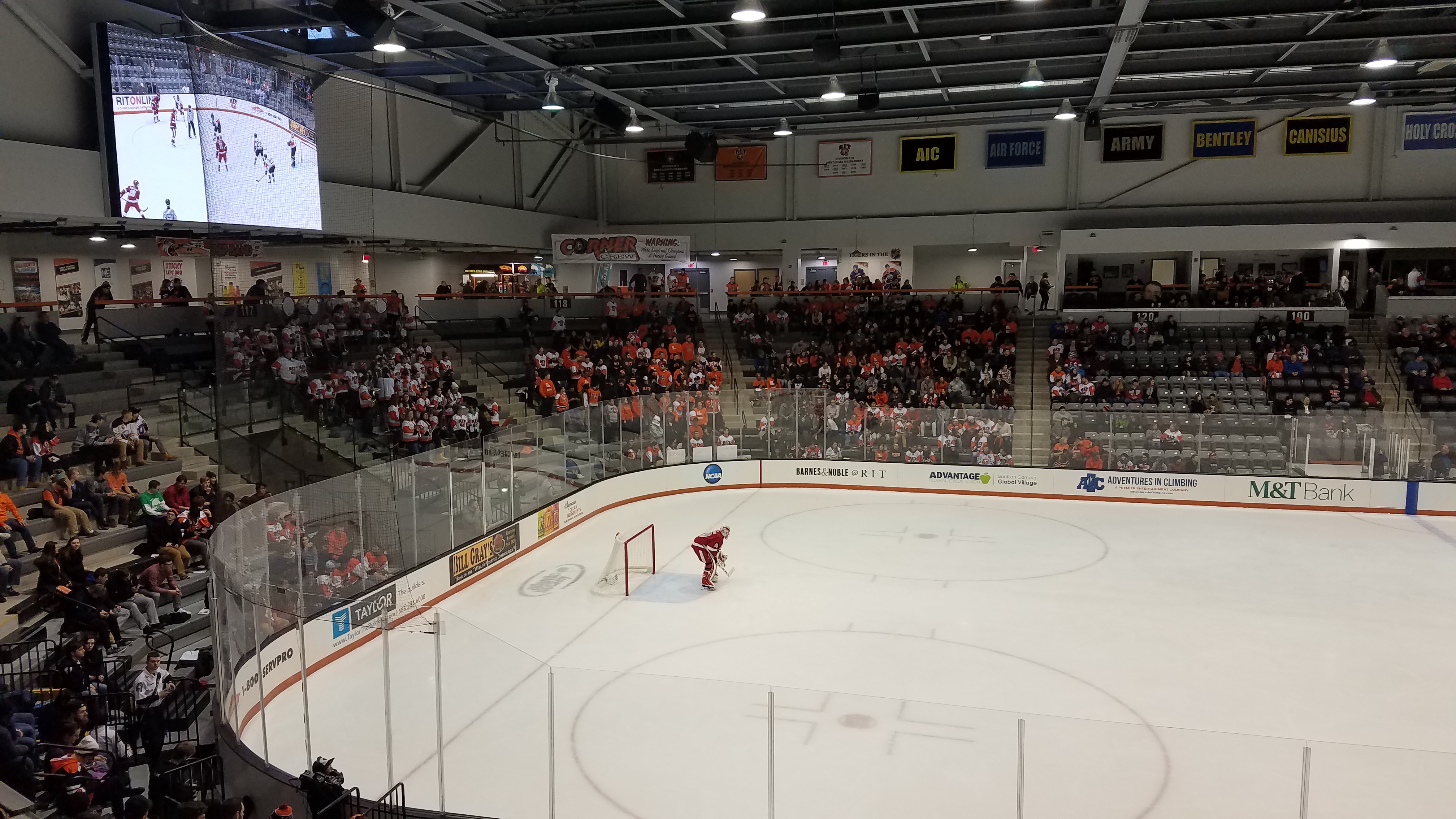 It’s been a very cold and snowy start to the winter here in the East, so I felt fortunate to squeeze this trip in as it is rare to get a schedule to cooperate for two games in the Lake Effect Snowbelt. My drive up to Rochester was uneventful and timing couldn’t have been more perfect as I arrived at RIT’s Gene Polisseni Center right as the gates opened at 5:30 PM. That gave me plenty of time to take a tour at this beautiful facility built in 2014. The entrance is my favorite part of the arena as you enter into an atrium at ice-level that is accented by orange walls and a holographic-like Hall of Fame display. Given that this is the Rochester Institute of Technology, it was cool that they showed their stuff by having a pretty neat Virtual Reality experience. Upstairs, the area above the seating allows more room to walk around, view displays, get food or use the standing rail to watch the game. It’s probably one of the best concourse set-ups I’ve seen for a small hockey arena. The bowl itself rounds the rink in standard fashion and it is adequate, though the seats are a little tight.