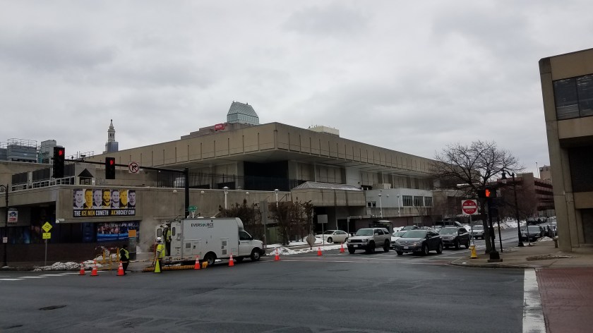 The next morning featured a steady light snow as I stayed in to catch up on work remotely. Roads were fine as I made the 20-minute drive back to Springfield. Those looking to spend time in the city, there are the aforementioned attractions, while the biggest one is the Basketball Hall of Fame, which is close to downtown. It is pretty awesome and I’ve been there a few times. The reason I went back this afternoon was for some college hockey as American International College (AIC) started playing here recently instead of the municipal rink in West Springfield (the Olympia Ice Center). That one may have been dinky, this one is much too large. AIC is second-lowest in NCAA attendance and around 500 people came out for the last home game of the year. The folks on hand did a respectable job cheering their boys on and there was a little pep in the building, which I did not expect. The Yellow Jackets responded with a 4-1 win that clinched the Atlantic Hockey Regular-Season crown for the first time in their long-suffering history. While being off-campus is a disadvantage, the MassMutual Center has way better amenities, hence the move and why their opponent Sacred Heart did the same thing a few years ago by taking up shop in Bridgeport’s arena.