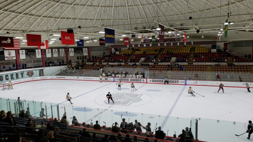 Brown had a hockey game at night and I went to Meehan Auditorium to check out their match-up with Clarkson. The rink is too small to be on The List, yet I really enjoyed it despite the small seating size. The overhead dome cover and high seating on the sides make for a nice place to watch a game (except for the freezing temperature). As for the experience itself, not a lot went right here. First, the Brown ticket office screwed up my will-call ticket, so I had to wait in the lobby 20 minutes (not exaggerating with time) until someone could find the ticket. Meanwhile, maybe 50 people arrived to the game, so it wasn’t close to being busy. During the second period, I was on the phone most of the time with my wife as our 4-year old daughter decided to lock some doors in the house. The lockable doors have that pinhole that you can unlock from the outside, except for one….the walk-in closet door in our bedroom. For some idiotic reason, the designers or previous owners put a lock that you need a key to get in. So, of course that got shut and locked with our cat inside. We don’t have a key and couldn’t pick it. With the cat crying and scratching, options were down to a locksmith during off-hours or the volunteer fire department. We went with the Fire Dept., who have dealt with things like this before and it’s a good thing we called because my wife (and me for that matter) would not have a chance at getting it open. They used some special tools and thankfully didn’t destroy the door too much to get it open. Thank you to the Hackettstown Fire Dept! Needless to say, I didn’t really get to focus on the game and before I knew it, the game went to OT, with Clarkson prevailing. Kids!!!