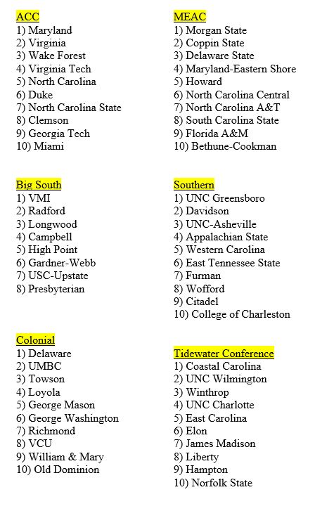 Southern: A conference steeped in tradition, but one that has seen many member changes. It’s been a pretty good league of late and many of these schools are great partners. The Asheville/App State/WCU/ETSU group make up the Smoky Mountain section, while the rest are in the Carolinas. Welcome back Davidson!