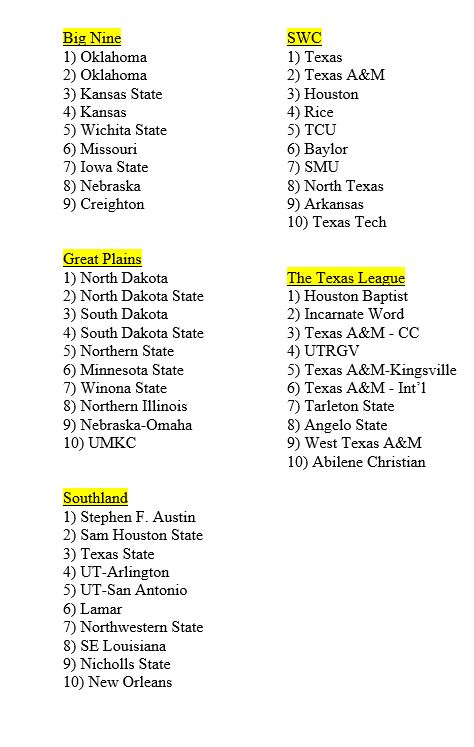 Texas League: Easily could be moved to Division II instead, especially since there are 5 teams currently at that level. Needed a home for the recent arrivals: Houston Baptist, Incarnate Word and Abilene Christian. They join UTRGV from the WAC and TAMU-CC from the Southland.