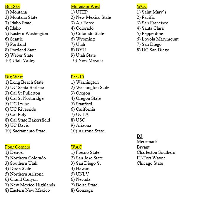 Big Sky: Keeping things in the northern part of the west is the Big Sky. Not too many changes here, except that Portland leaves their long-time WCC to join local rival Portland State.