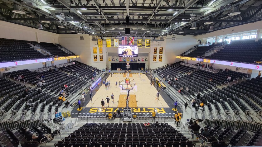 With not much time left in the college basketball season, I finally was able to get the weather and seasonal sickness to dissipate long enough for a trip. I’ve yet to really explore much of the DMV when it comes to the sport and there is a lot to cover as over a dozen teams play in the area. My first stop was Catonsville, a suburb of Baltimore about 15 minutes to the southwest. This is the home of the University of Maryland – Baltimore County, better known as UMBC. Those four letters will live in NCAA history as they were the first 16 seed to defeat a 1 seed as they handily defeated Virginia in 2018. When the moment happened, I was in Lake Placid, visiting Herb Brooks Arena for the ECAC Hockey Tournament final. At some point a 16 seed win was going to happen and there’s been times where I’ve thought certain teams have had that “look”. This wasn’t one of them and I was blown away at not just the result, but how large the margin was (like everybody). I didn’t have much interest ahead of time because I was (and still am) in my conference balance state of mind. It always bothered me that UMBC plays in the America East as it is such a geographic outlier with the next closest school being over four hours away. I’d have them in a league with other similar, nearby schools, like Towson, Delaware, Drexel. That 2018 win coincided with the opening of a new arena on campus and it is a nice building to watch basketball in. It’s easy to get to and parking is plentiful. The inside itself is awesome as they went with a double-decker horseshoe bowl despite only having 4,654 seats. I just wish they would let people sit in the upper-deck for the better vantage point as it was blocked off during my visit. There are other issues that you wouldn’t expect from an arena built less than five years ago and those are detailed in the more thorough review here. Otherwise, the seats are black, the scoreboard is impressive and the sightlines are solid. It was Senior Day and the Retrievers easily handled Maine, who sadly is in the running for worst D1 team in the country. They won 93-79 in front of a small crowd.