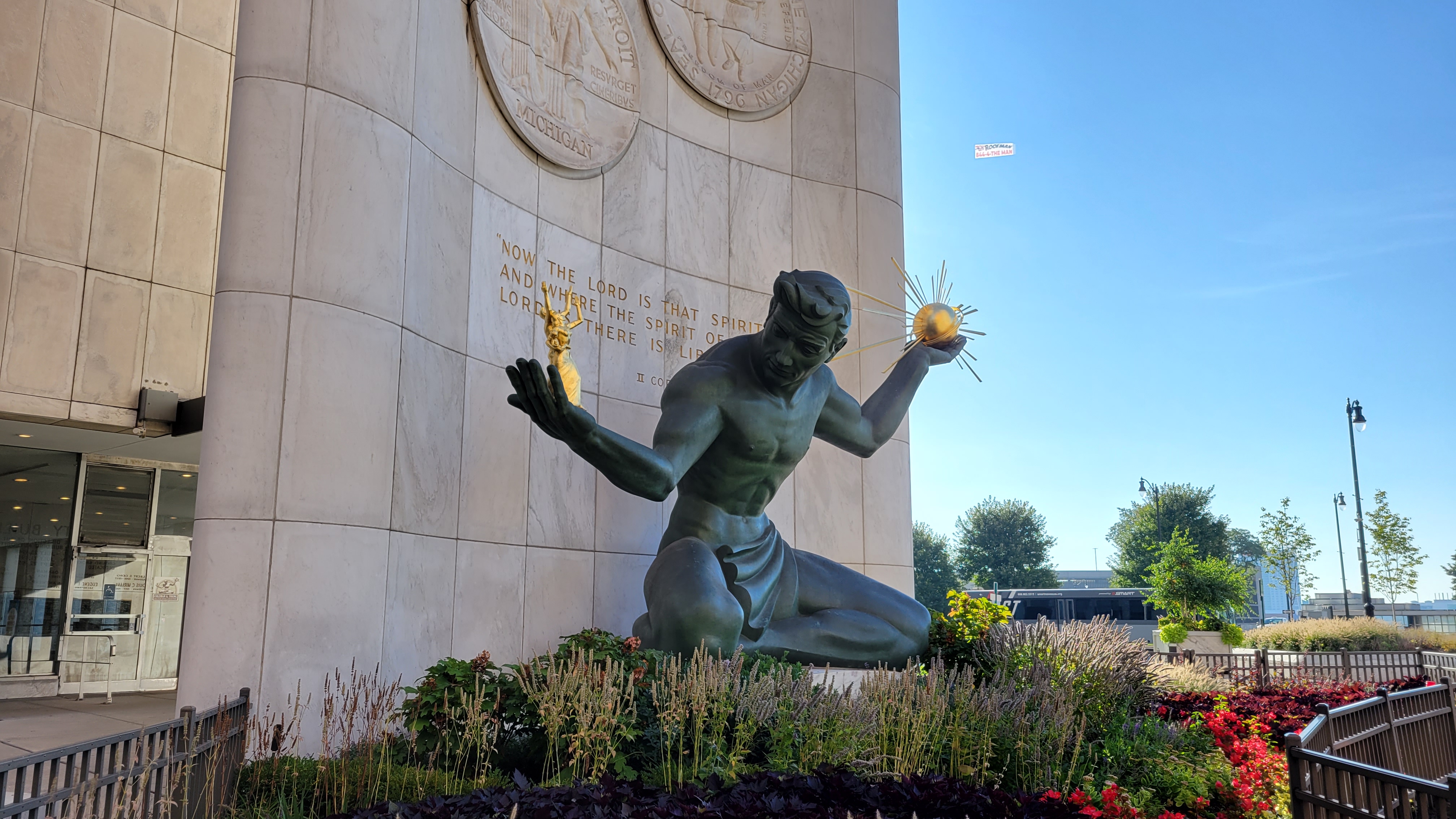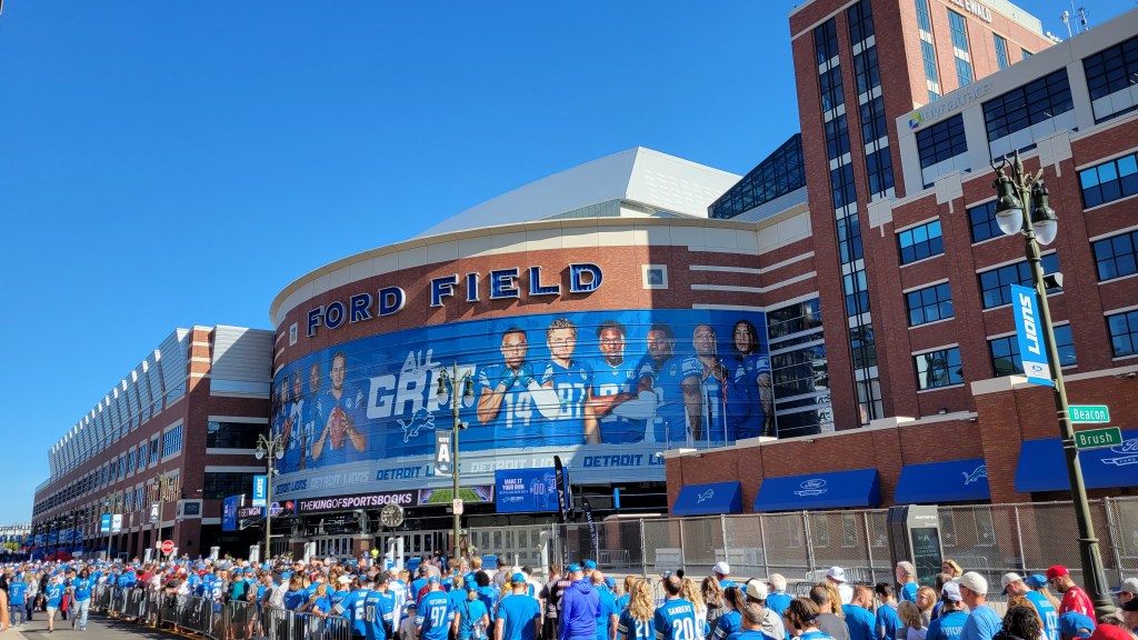Afterwards, we enjoyed Lebanese food by having a dinner at The Beirut and then finished the night at Hollywood Casino for gambling and a decent slate of college games (including Ohio State – Notre Dame). The next morning, it was on to Detroit and we got an early start for the 55 minute drive. When I was last here in the summer, I didn’t get a chance to explore downtown and this time around, I took advantage of a beautiful morning. My scouting for parking brought me to the Port Atwater Parking Garage, close to the Riverfront. This was just $15 for the day and it was an 18-minute walk to Ford Field. Even better, there was no traffic when getting out of the garage after the game and it only took a few minutes to get back on I-375. When you have a 5+ hour drive to follow, these things matter. Back to the morning, Detroit has impressive skyscrapers, monuments and urban parks and it was worth the time to see them. Yeah, the city still has issues, but preconceived notions of Detroit are likely wrong and you’ll be quite surprised when walking much of downtown. After a satisfying breakfast with plenty of other Lions fans at the Dime Store, we made our way to Ford Field. A couple hours before gametime and it was jammed as many were at Pride Plaza, ready to enter right when gates opened at 11 AM. Watching a football game indoors is unique and I got to say, it was great to not worry about temperature, precipitation or even the sun in your eyes. What I loved about Ford Field was how they stacked all of the suites on one side of the stadium. This enable the upper deck on the other side to not be as far away from the field. However, here, it seemed that the rows went outwards much farther than other stadiums with not as sharp an incline. Outside of that, I really liked the place.