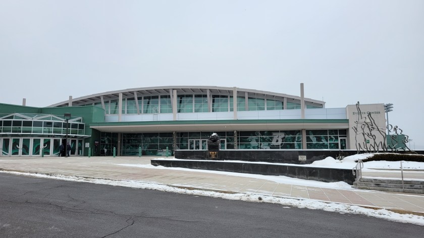 Visiting an arena just a year after opening is something I’ve shied away from as I’ve grown with Stadium Reviews. There’s often unfinished aspects or pain points that get cleaned up in the early years. I also try to go to an “average” game to get a better gauge of true atmosphere/fan support (that Vermont game was hyped up and it was a sell out). It was a long time coming for a return visit and last Saturday I finally made it back on an almost as cold day (12 degrees). Thank you to the nice person at the ticket booth who gave both my daughters and I the youth ticket price, which means we got in for just $6 each. Throw in free parking and cheap concessions and you have a great afternoon out. I really love the Events Center as the multi-purpose facility looks like a basketball arena despite it sitting on an indoor track. The concourse is open and there is a lot of green in the building to help add character, the team displays are great too. Once again, a game that I saw the Bearcats in was one where the home side was completely overmatched. Binghamton never was in this game against UMass-Lowell, another team I have a secret love for. Earlier in the year, after the Riverhawks beat Georgia Tech, they were 3-0 and beating Arizona State by 10 points. They blew that lead and lost, then had a few head-scratchers after that. Lowell is back on track and they sit at 15-4 with a legitimate chance to dethrone Vermont as conference kings. In the game I saw against Binghamton, they won by 20.
