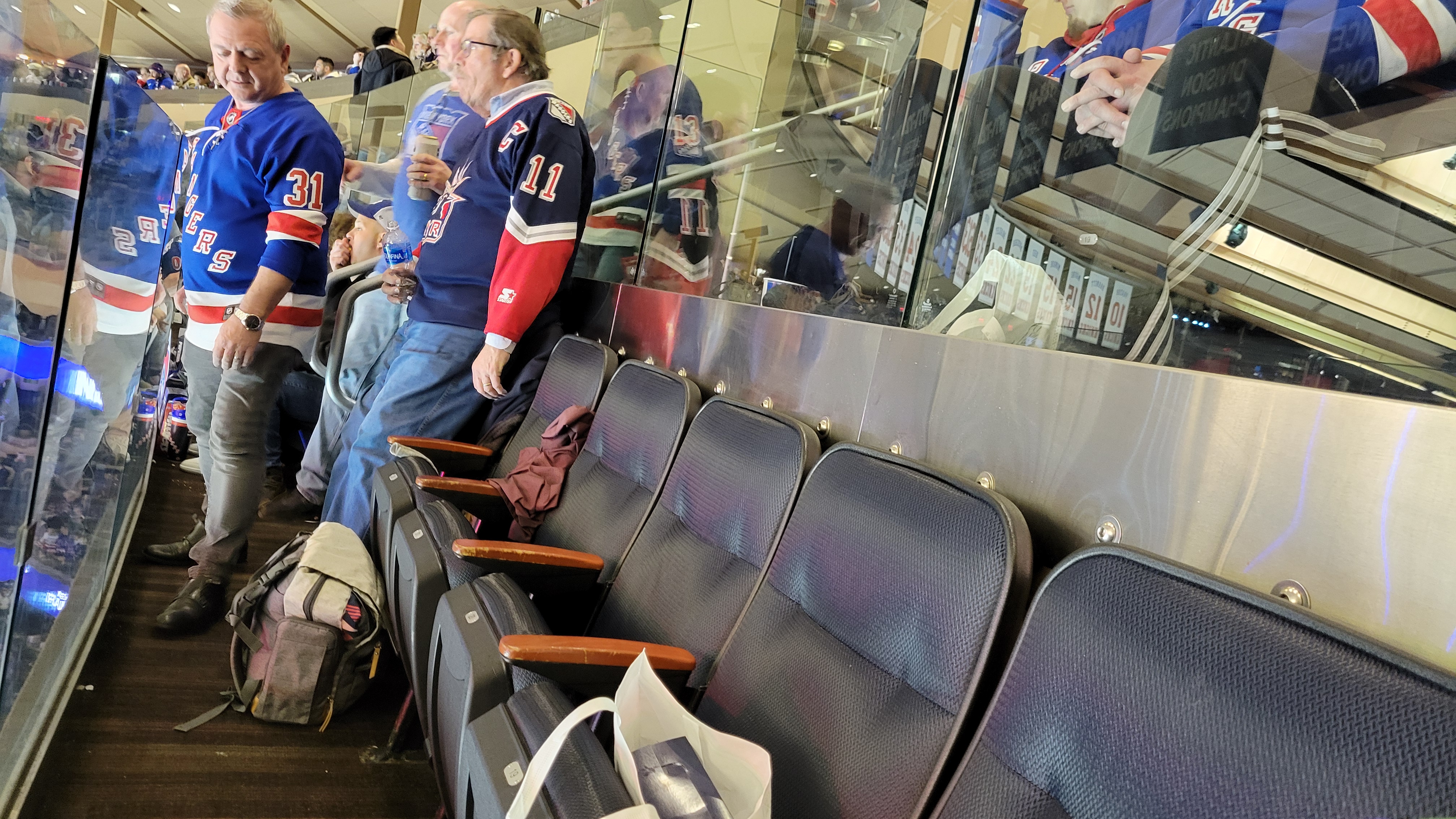 After the game, it was a brutal walk back as the wind got my pants drenched. Thankfully, I had a pair of extra socks to change into and that helped a bit (to which my brother responded like Harry Dunne). Back into the City, we had dinner at Mustang Harry’s and then walked a block to Madison Square Garden. I’ve written a few times on experiences here, so I won’t rehash the building as that can be seen in the review. It is (so far) my favorite NHL atmosphere and this crowd did not disappoint again. They are loud, vulgar and love their Rangers. The 8:15 PM start probably helped getting them more juiced up. It blows me away that they can play a basketball game in the afternoon and then 3 hours later have the ice surface ready for a hockey game at night. It worked in our favor for time between games, but backfired afterwards as overtime and a train delay meant we didn’t leave Penn Station until 12:06 AM and didn’t get back home to Northwest Jersey until 1:18 AM. At least we were treated to an amazing game as two top teams battled. Florida built a 2-0 lead and then the Rangers rapidly answered to tie it in the middle of the second period. They dominated the third, but it was one of those moments where you just felt a goal coming for Florida the first time they had extended zone time. That came with 4:08 to play, but what I didn’t expect was Artemi Panarin scoring 43 seconds later to tie it again for the Rangers. It was his second of the night and 43rd of the season. The game went to overtime, which was pretty good in spite of me hating that occasionally dull possession-based 3-on-3 format. The shootout featured a brilliant move by Mika Zibanejad and the Rangers won. Instead of sitting in the awful 200s with a distanced view and the Bridge blocking the scoreboard, I found seats at a similar price in the first row of the Bridge (300) level. Sitting here, I changed my view of the feature as it provides one of the most unique seats in the NHL (see below).
