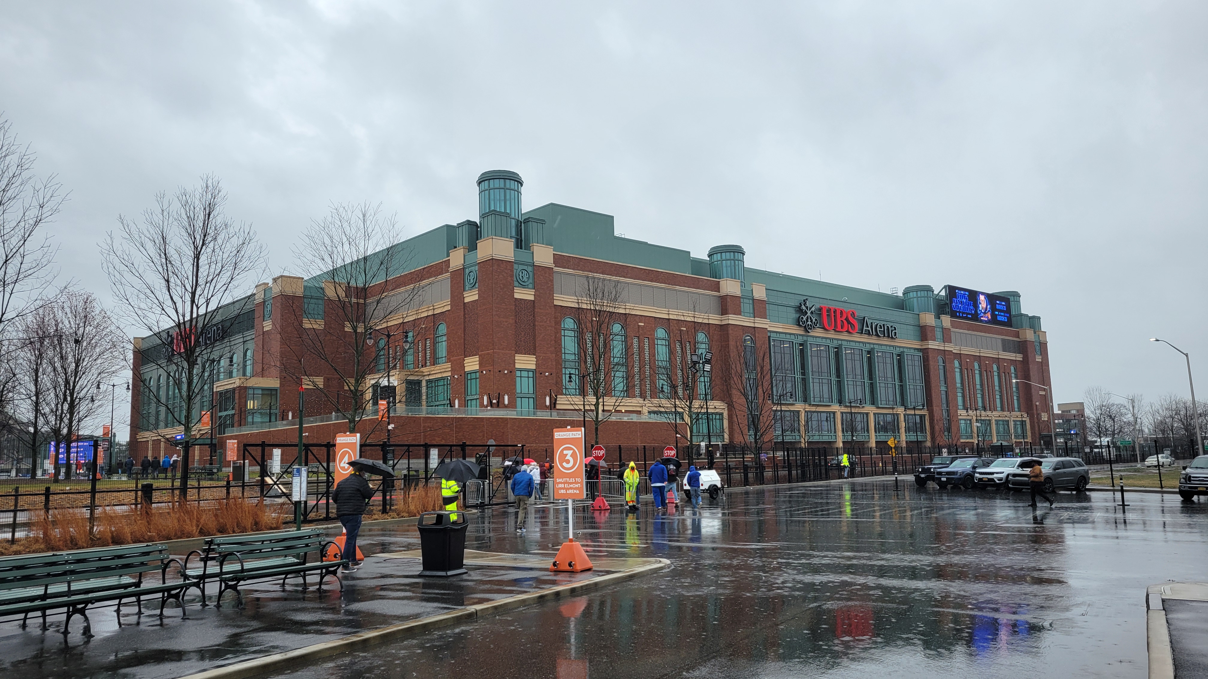 UBS Arena opened a couple years ago and with it being a 1-2 hour trip (depending on traffic and trains) from my house, I saw a good opportunity on the calendar late in March. The Islanders were starting at 1:00 PM and the Rangers at 8:00 PM with both teams still having something to play for. The incredible disparity in secondary market ticket prices I supposed balanced things out as we got seats for $30 to begin the day and then had to spend $200 just to get in to see the Rangers. Insane how expensive they are. My brother joined me for this trip and the weather was as awful as it could be without leading to cancellations. It poured the majority of the day with 3 inches of rain causing some flooding issues around the area. This led to a few accidents on I-80, but we arrived to the train station in Secaucus on time. From there, it’s a 10-minute train ride to Penn Station in NYC and then 35 minutes on the LIRR to the Elmont station near UBS Arena. The location is not ideal as it is a very long walk around the horse track to get to the arena (there is overhead cover though from the elements). They also had shuttles ready and we hopped on that. After getting out, I balanced an umbrella and picture-taking for the beautiful exterior of this arena that so beautifully compliments the nearby surroundings of famed Belmont.