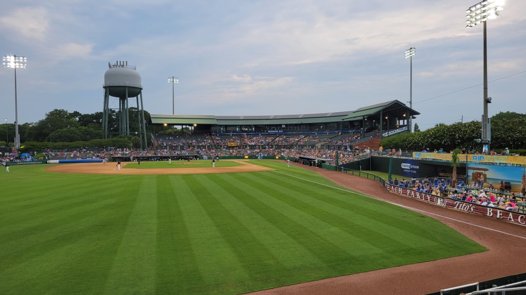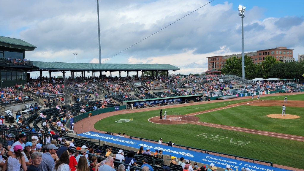 We are back! It was a hot and sweaty trip south as our family enjoyed checking out the Palmetto State…where the people were friendly, the sights were beautiful and the food was satisfying. There were three ballpark visits along the way and we drove, splitting the journey into two days from New Jersey. The first stop was Salem, VA and traffic slowed our arrival as we got there around 5 PM (I’m beginning to think I-81 in Virginia is just as bad as I-95 in terms congestion and accidents). Within the Roanoke Valley, Salem acts like a suburb to the larger city, but one that has it’s own little small downtown, which we drove through before reaching the ballpark. It was 95 degrees, but a breeze helped and it thankfully cooled off quickly as the sun went down. This is an older ballpark with a different design as the home plate area is quite open and airy. Seating sections are broken out into three levels, with a lot of space in between and that leads to distanced seating. The vibe is laid back with minimal sound effects and promotions and that fits the setting as it is serene with the close-up view of the Blue Ridge Mountains. There were negative aspects though and a lot of just felt lazy, like no parking signs for getting to the ballpark lot (we initially parked in the arena lot as it’s a big complex). The Kids Play area had some shaky bounce houses and my wife said at least a dozen parents got redirected to a different area for wristbands as there were no signs. Meanwhile, the replica Fenway Park section was just sad. Give this park some TLC and it can really shine as that view is hard to beat on the East Coast.