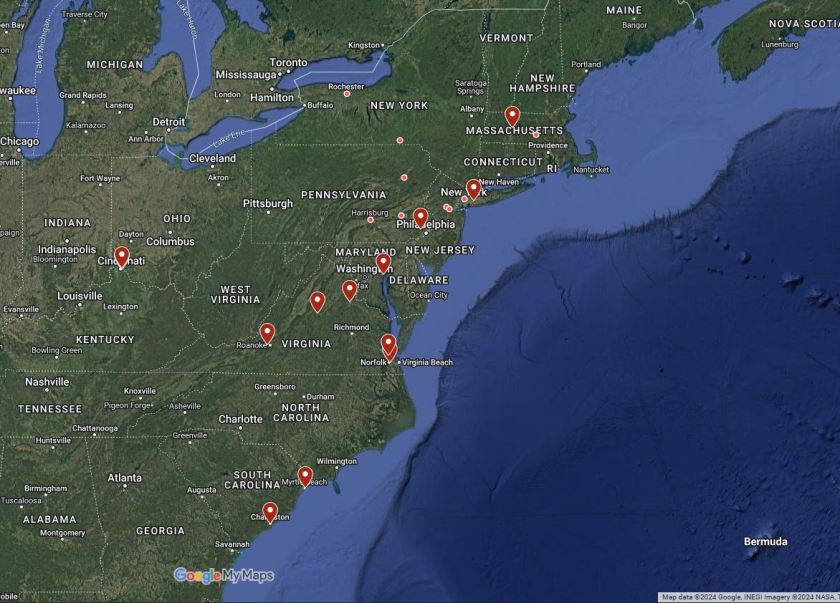 THE WEATHER: 13 good days, 5 ok days and 2 bad days…..For the outdoor games, I was really fortunate as it was great, especially for football. Cincinnati and Hampton were just beautiful (60s/70s and no rain). Baseball games were mostly comfortable too, though it shouldn’t be a surprise that it was hot and humid in South Carolina during late June. The only bad weather issues were when travelling to hockey games. First, was heavy rain as 2-3 inches led to limited outdoor pictures for UBS Arena and I also saw a bad hydroplaning accident driving to the game. The following season, snow covered the roadways for a return trip to see the Rochester Amerks, thankfully without any travel accidents.