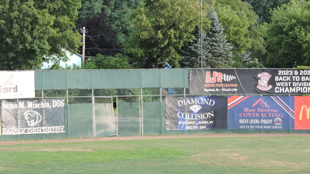 Let’s start with when I checked their website and Twitter account for what was upcoming at the game. This is the link I see, which is on their website. That’s right, they promote a parody account essentially ripping the team and stadium. Probably should fix that, especially since their “official” account has all of 27 followers (vs 2181 from the other). Next is parking, which is a free-for-all on the grassy area in front of the stadium. Everyone seemed to know where to make a row, but that was an interesting arrival and I had fears of getting blocked in. Then we get inside and whoo-whee…..I see: 2×4’s replacing chairs across a good chunk of the grandstand. Video no longer working on the scoreboard, so they slapped a Pioneers banner over it. Part of the outfield wall is busted. A field that is beyond atrocious. The playing surface was so bad that it impacted the game as there were bad hops all over the place. There were 7 errors in this game and even worse, this 9-inning game took 4 hours and 17 minutes to play! That is insanity and thank goodness we left early because I didn’t want my 6-year old getting to bed too late (we still had a 2-hour drive after the game to the Grandparents in Rochester). There’s even video evidence of this monstrosity with high comedy in that the scorebug completely blocks the view of left field. Dunn Field may be a historical ballpark, but the Elmira Pioneers are an adventure for sure.