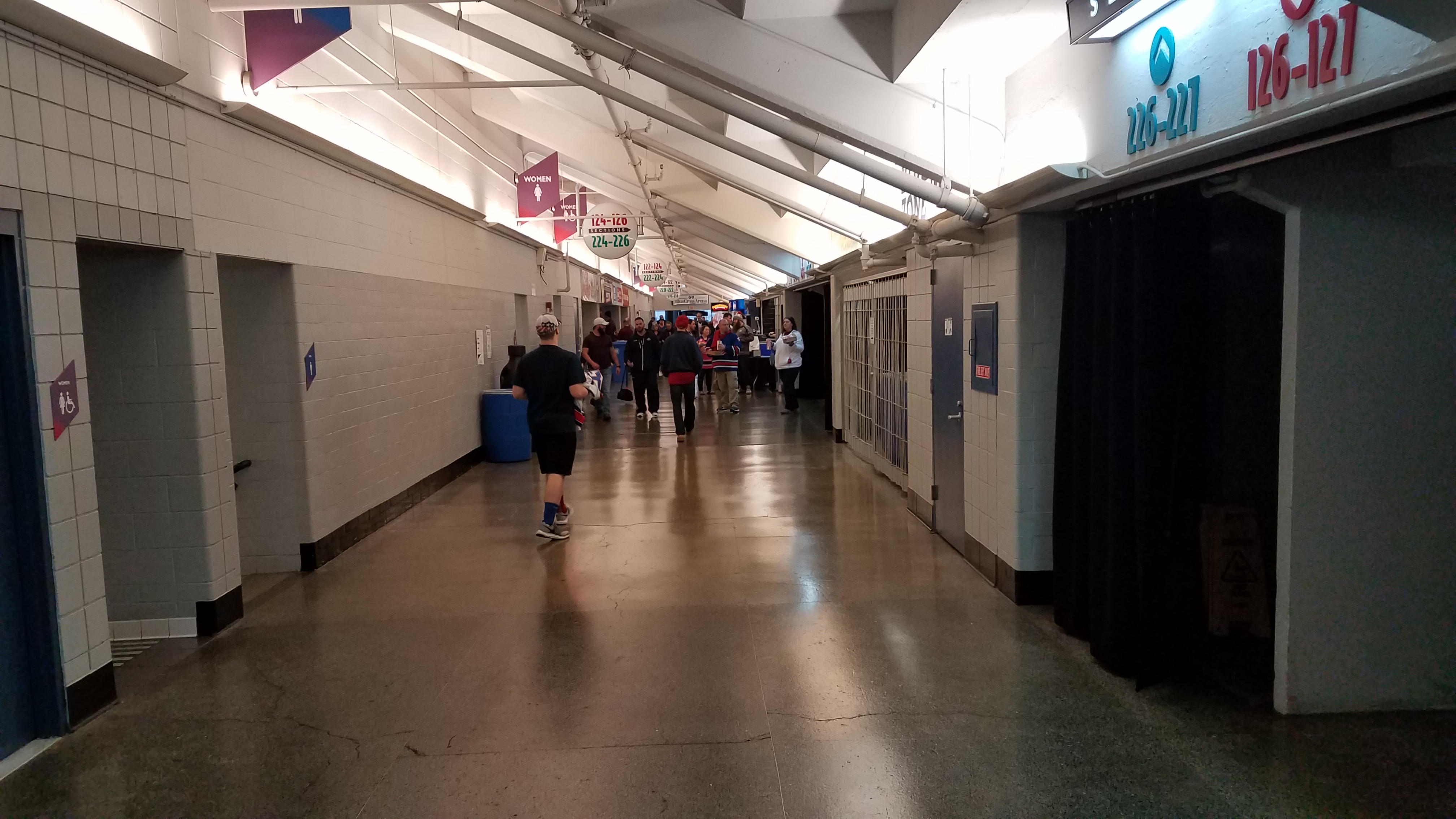 After entering, fans start in the very spacious and bright atrium, where there is plenty of space before going past the ticket takers. This section also includes the team store and box office. A large flight of stairs leads to an opening of the concourse featuring a carpeted section that has become a large bar. Pre-game entertainment that includes a band makes this area a reason to come to the game early. With high top tables, counter space and a beautiful background of the river and city, it’s easy to see why this space is so popular. Further into the arena, the concourses are a much different story as the near 70-year age shows. Side hallways are very tight and old. There at least is a side off-shoot on each one that opens up a little more space.