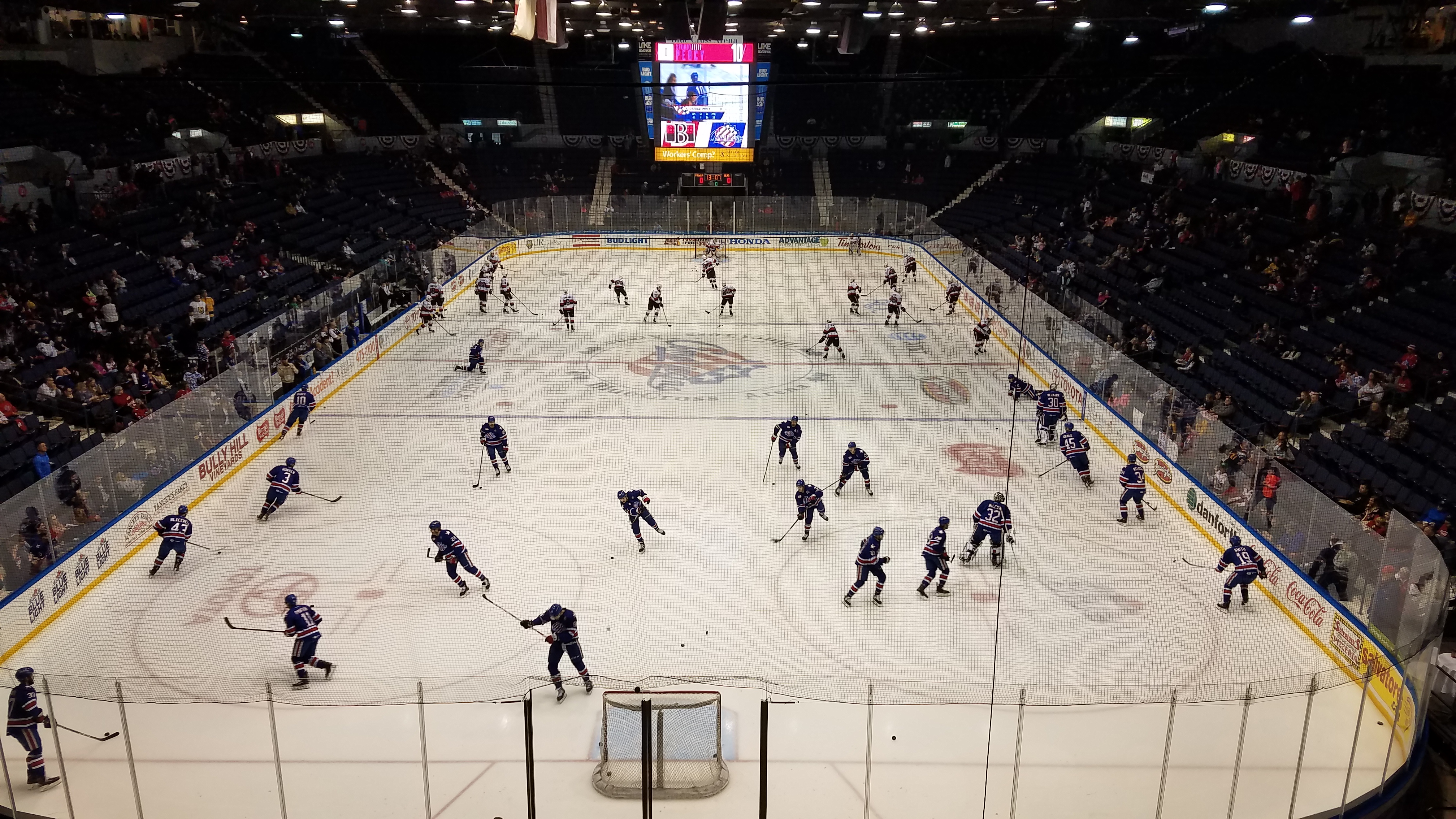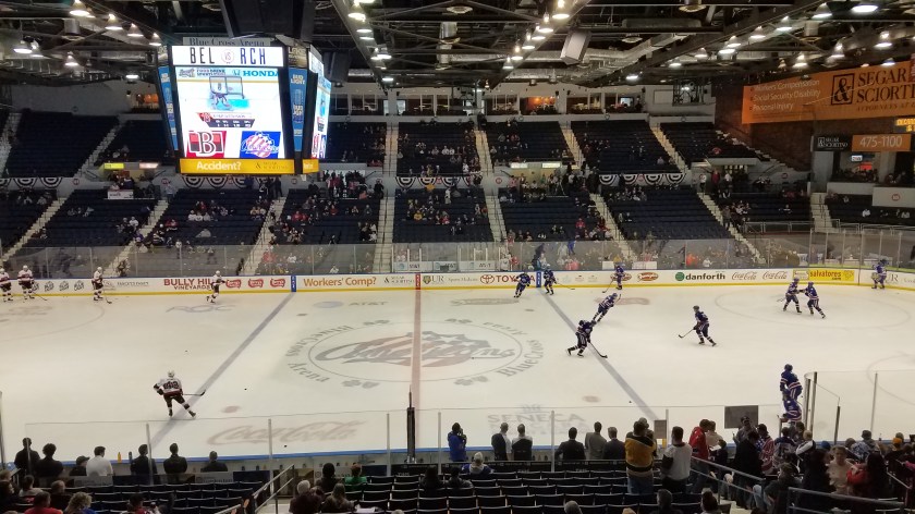 Inside, the atmosphere features the occasional “Let’s Go Amerks” chants and you’ll see a lot of fans wearing jerseys of that beautiful crest. After a decade or two where Blue Cross Arena was just a standard AHL experience, the atmosphere has improved as fans have come back. The crowd gets into the game and it’s nice to see many get on their feet after a goal. The horn that they use is the same one that I heard as a kid back in the 90s and even better, is long-time favorite “Freeze Frame” playing after the first couple goals of the game. The building can get quite loud and the playoff atmosphere is one of the league’s best.