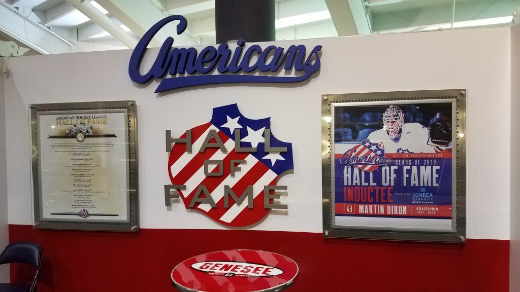 The Amerks do a great job with displays and it starts in the concourse. Remember, this is a War Memorial and the arena honors local veterans. Tucked in a corner behind the main entrance are several plaques doing just that. It’s too bad this section is not more visible to the public as one has to search for it. When it comes to team honors, Rochester does that well too. Above the bar in the concourse, the team has hung replicas of their red championship banners. This section also includes the Amerks Hall of Fame and the wall represents a Who’s Who of the hockey world. A few steps away is a large info plaque for basketball legend Les Harrison, while further down is a section for the Rochester Lancers of the old NPSL. Blue Cross Arena honoring other sports continues in a lower-level lobby, where the Section V Hall of Fame is located. Section V is the division for local high schools and their basketball tournament is annually held here in “The Big House”. Inside the arena, the rafters at the south end have all of the Amerk banners and the white banners stick out as the Calder Cup championships. Jerseys for three players are retired: #6 Red Armstrong, #9 Dick Gamble and also #9 Jody Gage, who had a long and popular tenure with the franchise.