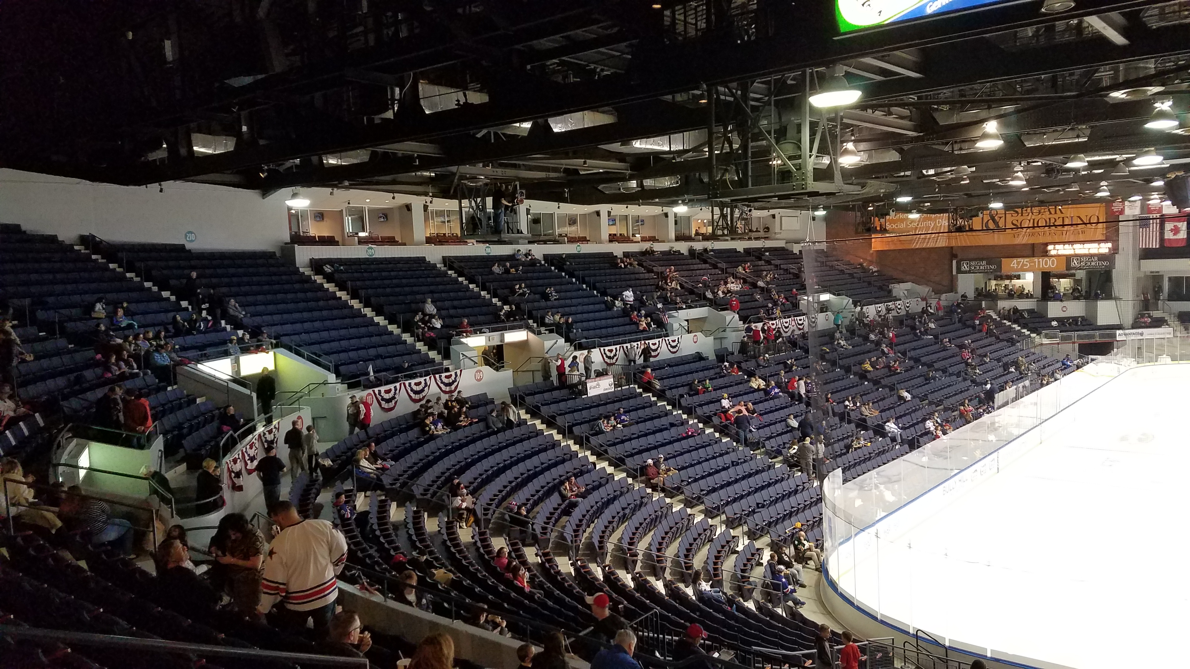 For somebody who doesn’t know that renovations were done to this arena, the inside is a complete surprise. It is dimly lit with a low roof and exposed heating ducts. Most of the dark blue seating arrangement is adequate with a split level on the sides and luxury suites at the top of that side seating. Sightlines are pretty good in those upper 200 seats as they have a natural, close view. Seats themselves though feel squeezed, both in width and length. It’s not all that comfortable for taller folks. The bowl is in a horseshoe shape as the south end is a unique design of seating with a very steep upper deck that is well above the first level of seats. The seats underneath have been replaced by a party area on the floor. Suites are in between the decks. The other end is not that good as there are plenty of seats in the standard design, but the second level extends far from the ice, secluding fans. The scoreboard even becomes obscured by the roof. These sections added a lot to the capacity as it went from 7,000 to 11,215 after the mid-90s renovation. This is certainly a unique building and there remains an old barn feel to it.