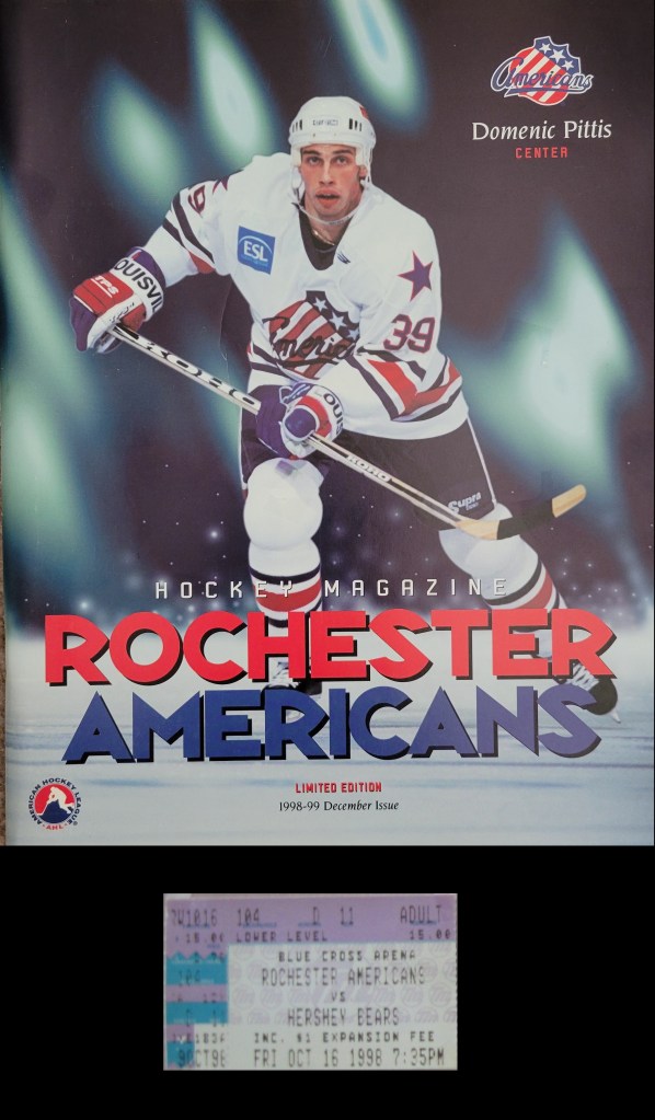This is one place that has felt like home to me and always brings back many great memories. I’ll never forget Walter the Accordion Man, sitting on his folding chair near an entrance. He would play that wonderful accordion and sing a tune as you walked to the arena, ready for some hockey. Always gave him a nod and may he rest in peace……Hearing the din of the lamps during the National Anthem as they get warmed up to turn back on is another long-time part of Amerks hockey……One of the best mascots in all of sports is entertaining fans before and during the game. The Moose simply is the best around as he/she is funny for all ages and charming to the kids……The one casualty of the previous ownership was the removal of Fred Costello, who played that great, old organ that I sorely miss. Now a mix of techno and arena pop fills the stands. Boo…..Play-by-play man Don Stevens is a legend around these parts. He has been the broadcaster since 1986 and his throaty call of the game is perfect for radio…..The other building tenant is the Rochester Knighthawks of the National Lacrosse League. They have been here since 1995……If the team is the “Americans”, why are they called “Amerks” when that’s not a term referring to people from the country? It likely was a newspaper abbreviation that stuck.