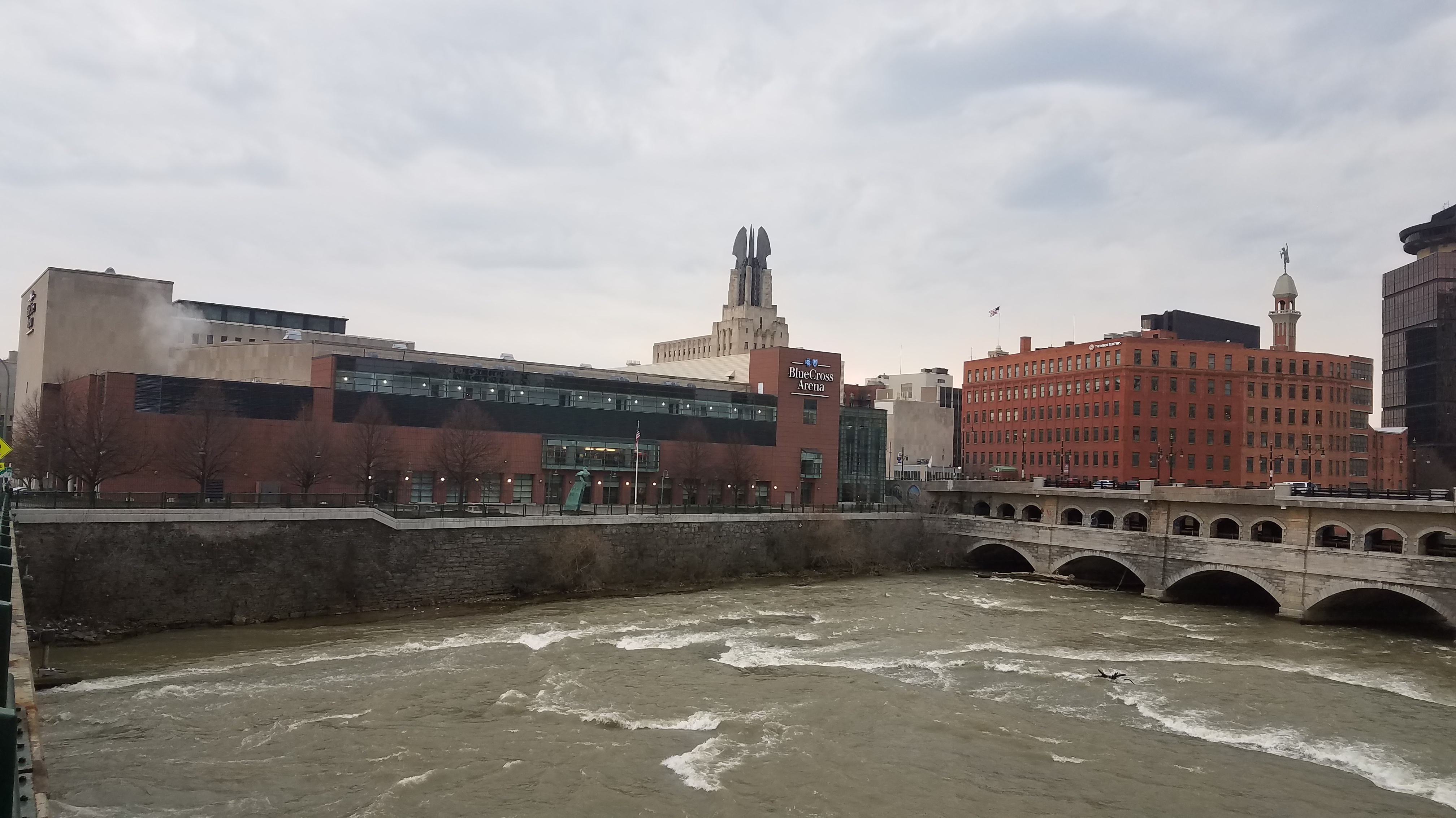 Rochester is the third largest city in New York with a population around 200,000 and it is located in the western part of the state, near Lake Ontario. Built on the rapid growth of big companies like Kodak and Xerox, their decline led to the city reinventing themselves as a technology and education hub. Rochester’s entertainment options aren’t too varied, though the Strong Museum and Eastman Museum are good visits. The area also has some really nice festivals. Blue Cross Arena is located on the Genesee River in downtown Rochester, amongst most of the city’s high-rise buildings. Though it is a scenic setting with the river and skyscrapers, the location is part of the business district in downtown, thus there is not much to do for visitors. The spot to eat nearby before or after games is Dinosaur Bar-B-Que. Give yourself plenty of time because this is really the only thing within walking distance despite being in the heart of the city. For a better vibe, head a mile away to the East End section, which features a more vibrant nightlife along East Ave.