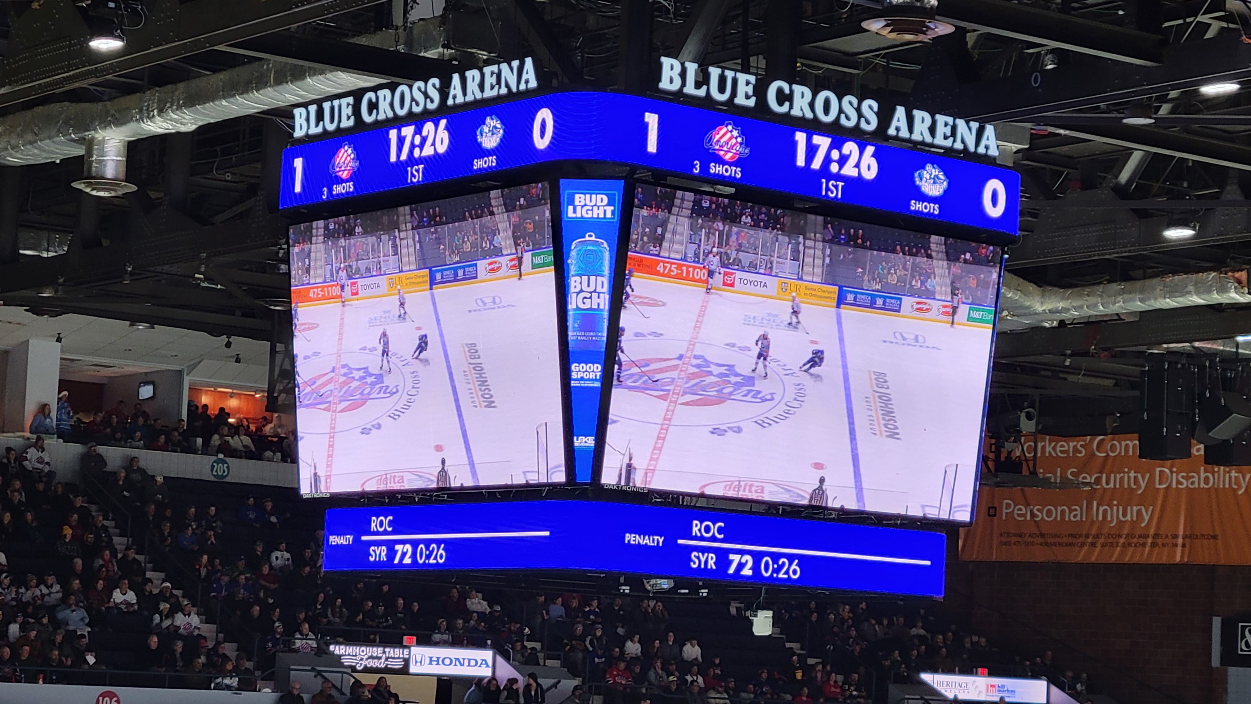 The thing that sticks out the most is how the scoreboard is centered over the blue line, creating a very strange look for those sitting on the side. It has always been like this. The board itself is decent and it consists of four sides, mostly made up of video. They put the game score/time/etc. at the bottom of the video display and then use the rest of the screen for video graphics, live game coverage and replays. Video quality is solid as this board debuted in 2018. A “Blue Cross Arena” logo sits on top of the scoreboard.