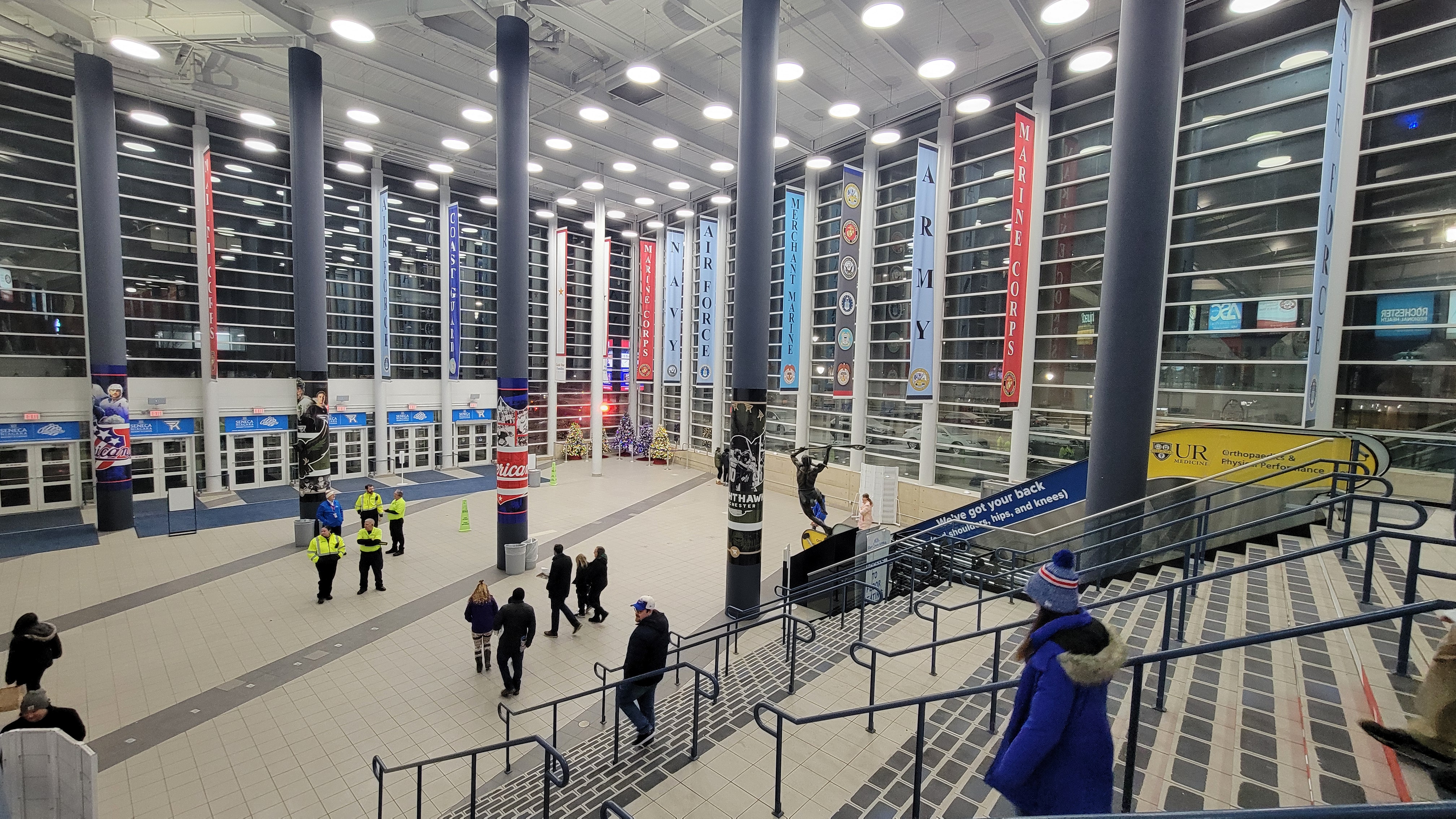 Several interstates lead into the area as I-90 (NY State Thruway) accommodates those going east-west, while I-390 takes care of anyone coming from the south. The city’s thoroughfare is I-490, but navigating it downtown can be tricky, especially when trying to find your way back to the expressway. The main parking garage is at the Civic Center across the street and it is one of the worst arena parking areas that I have ever been to. The advantage of being connected underground with the arena is not worth the aggravation of getting in and out. On a recent snowy night, it took me 25 minutes to move a couple blocks and park. That’s because the entrance is at a stoplight and in a horrible spot. Maneuvering this garage inside is terrible and then leaving took another 20 minutes with a lot of dead stops. Unless the weather is atrocious and you want to leave your jacket in the car, consider several other garages and surface lots within walking distance.