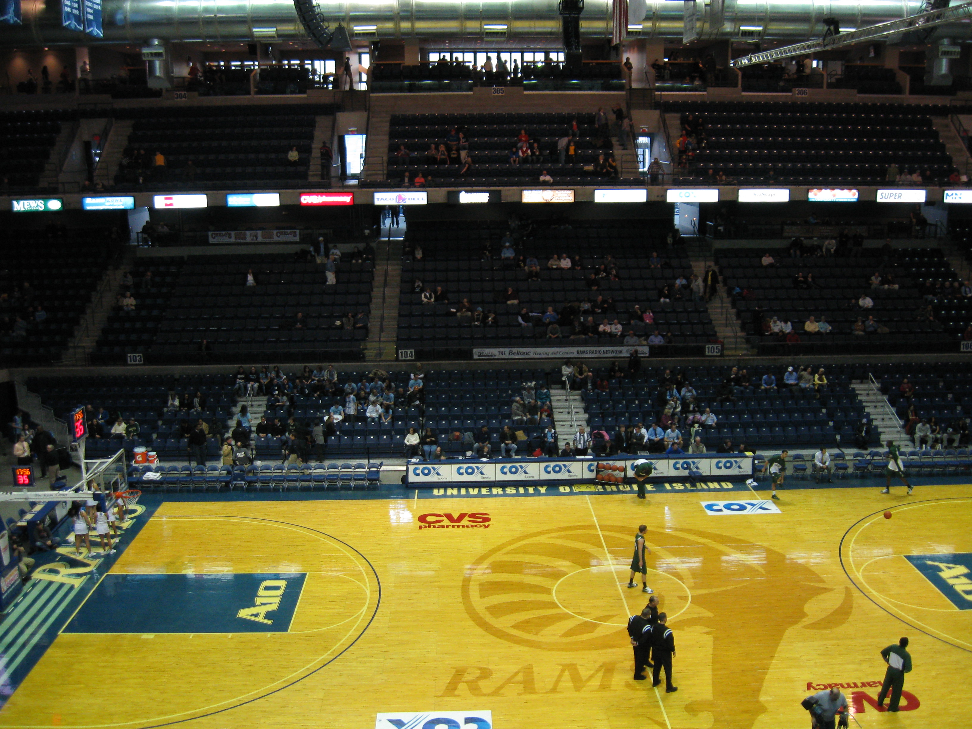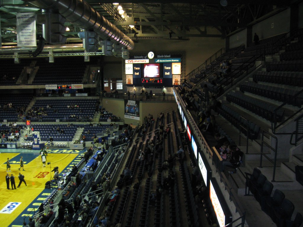 After a very lackluster showing by the crowd in the first half, the atmosphere improved as the game went on. URI playing awful did not help, however I found it terrible that fans were booing their team when shots weren’t going in. Not cool to boo college kids because they can’t make a shot. The lack of energy in the crowd can also be attributed to the weak student section, which numbered very few, even though they were trying to make noise. All the other students (pretty much wearing fraternity and sorority sweatshirts instead of school stuff) sat on their hands and made no effort to get into it, even when the game got exciting. As the proceedings got more interesting, the rest of the fans were more into it and many stood after made shots and big plays. Crowd noise escalated and it was downright loud at times, as it became a fine place to watch a game. URI is very tough at home with a 97-40 record, since the arena opened. Most of the chants just came from the student section and they consisted of “U-R-I…clap” and “Let’s go Rhody”.