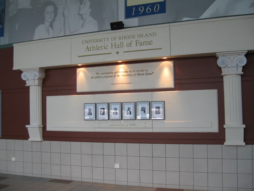 Upon entering the main foyer, the wall straight ahead features new inductees to the University of Rhode Island Athletic Hall of Fame. Also, throughout the rest of the concourse, each HOF class is displayed in the form of pictures. URI did a nice job with their banners inside the arena as they had a pleasing look to them. Each individual NCAA appearance (Men’s and Women’s) is lucky enough to have its own honor, complete with the year on it, along with how far the team advanced. One other banner has the years of the NIT appearances. Another set of plain, white banners is reserved for “The Stars of the Ryan Center”, which lists various acts that have performed there. Three retired numbers sit in the rafters and there’s only one for Men’s basketball and that one belongs to #3 Ernie Calverley. We could’ve use some URI basketball history, but the rest of the displays besides that missing piece were good.