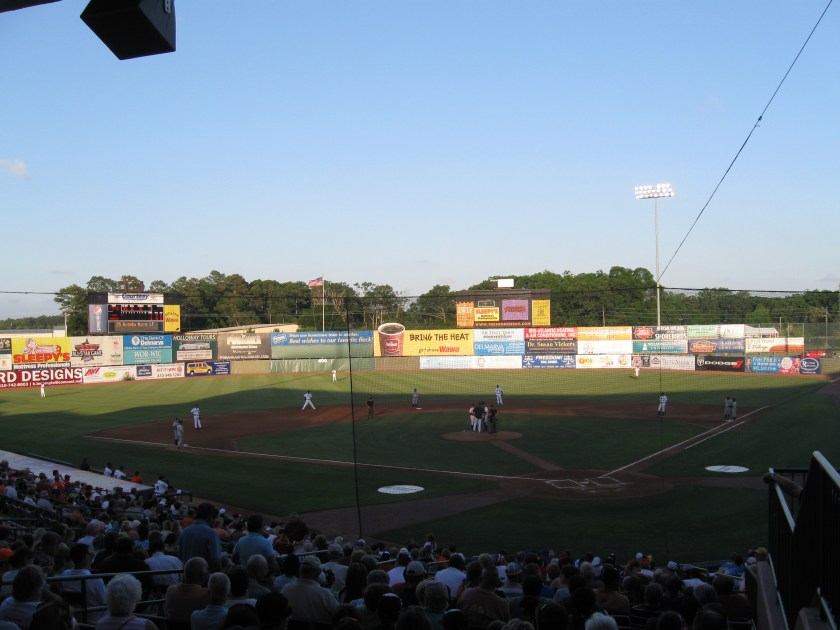 On this night, the Shorebirds announced an absurdly high attendance of 8,373. I of course know these attendance figures are inflated because they are tickets “sold”, but there’s no way that ballpark can fit another 3,173 people in their grassy areas, picnic spots and standing room only zones. Regardless, it was still an excellent crowd that had the stands nearly full on a perfect-weather Saturday Night that had fireworks. Their next home game (a hot Wednesday Night) had 1,731. Attendance seems very dependent on the night and promotion. This season, they average 2,729 thus far, good for middle-of the pack in the South Atlantic League. That is consistent with prior seasons. Keeping in mind the size of the market, Salisbury does well for themselves.