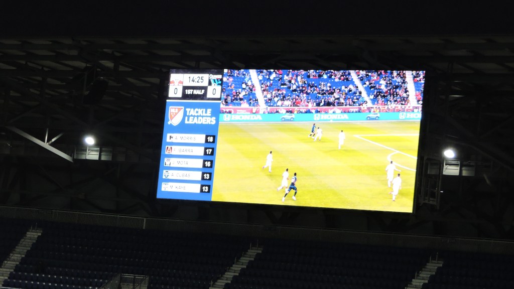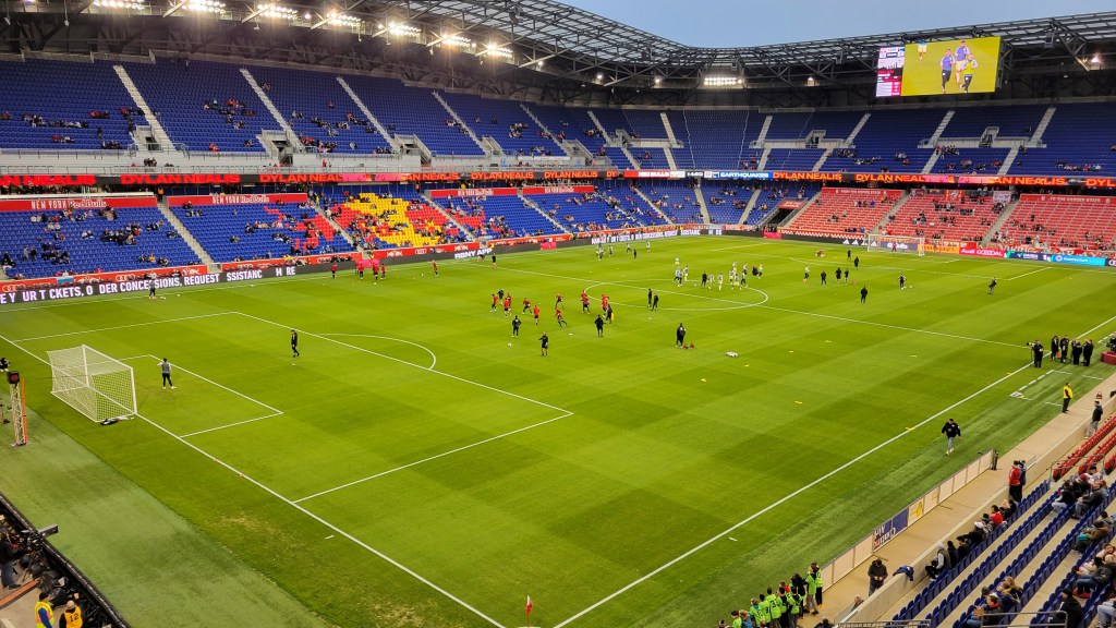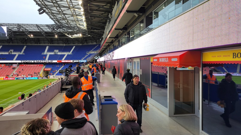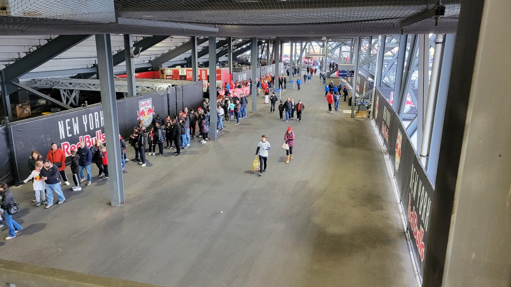 Despite never being full, the atmosphere is good, even early in the season. Getting things going is the South Ward, with groups like the Viking Army and the Empire Supporters Club. Constant drumming accompanies various songs and chants, with “We Love Ya” kicking it off. Numbers are down in the South Ward, but noise is still up and enhancing the atmosphere. The rest of the fans were knowledgeable and into the game with appropriate reactions, even for the smaller plays. “Let’s Go Red Bulls” chants would occasionally break out. Late in the 2023 game I attended, the crowd was certainly into it towards the end as the Red Bulls tried to find an equalizer and when they did score, the majority were on their feet, with a few jumping up and down. I liked the goal celebration too with red flames behind the goal and insanely loud “Bulls on Parade” playing by Rage Against the Machine. Good stuff. Stadium design helps keep in noise, even if it’s a little slow to reverberate.