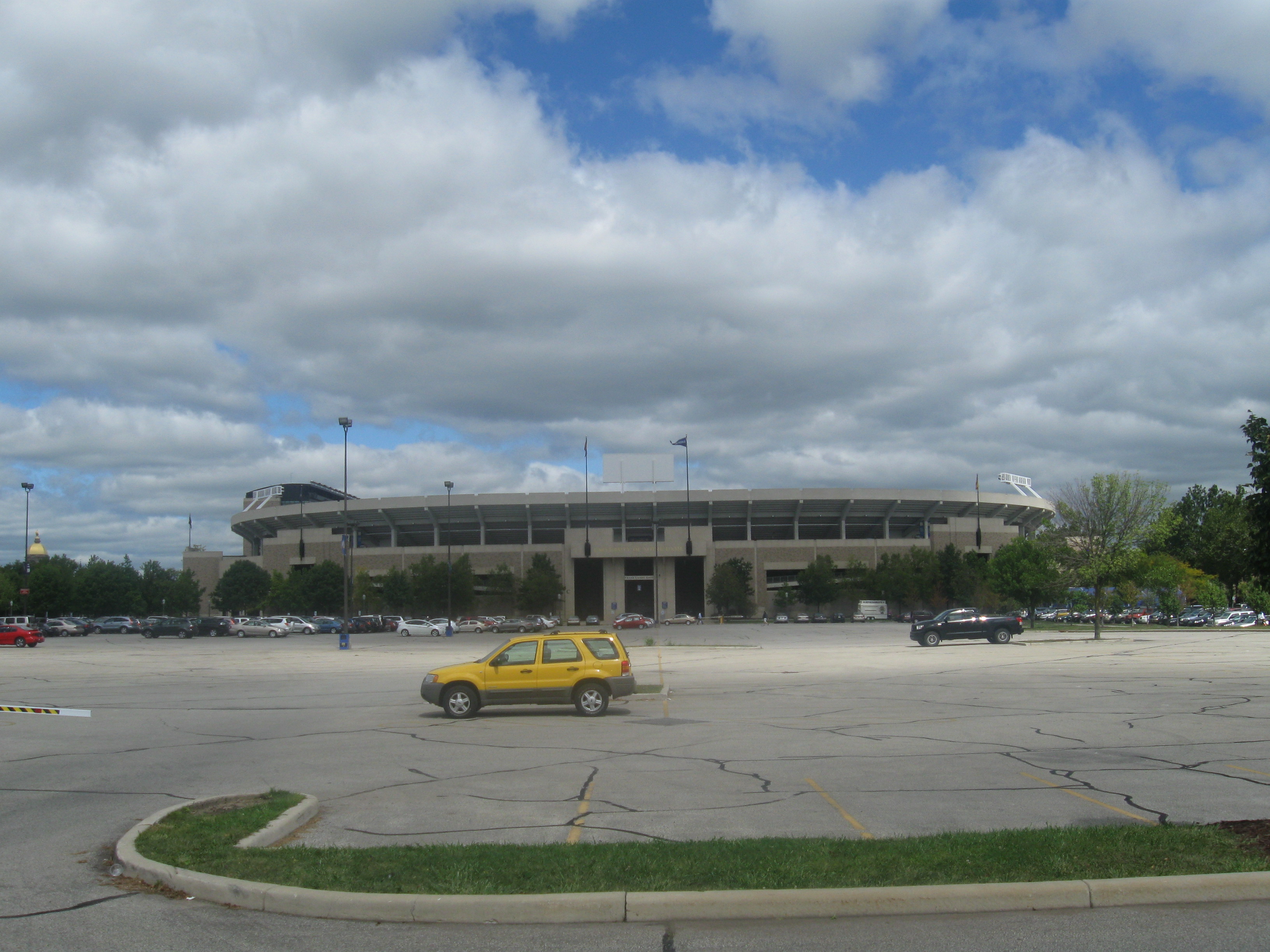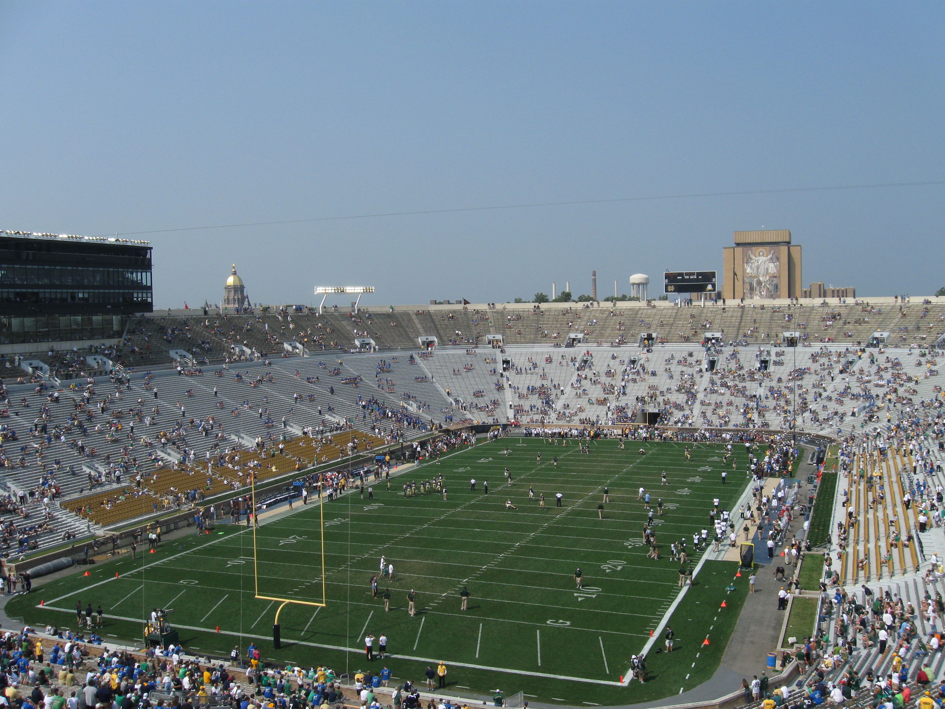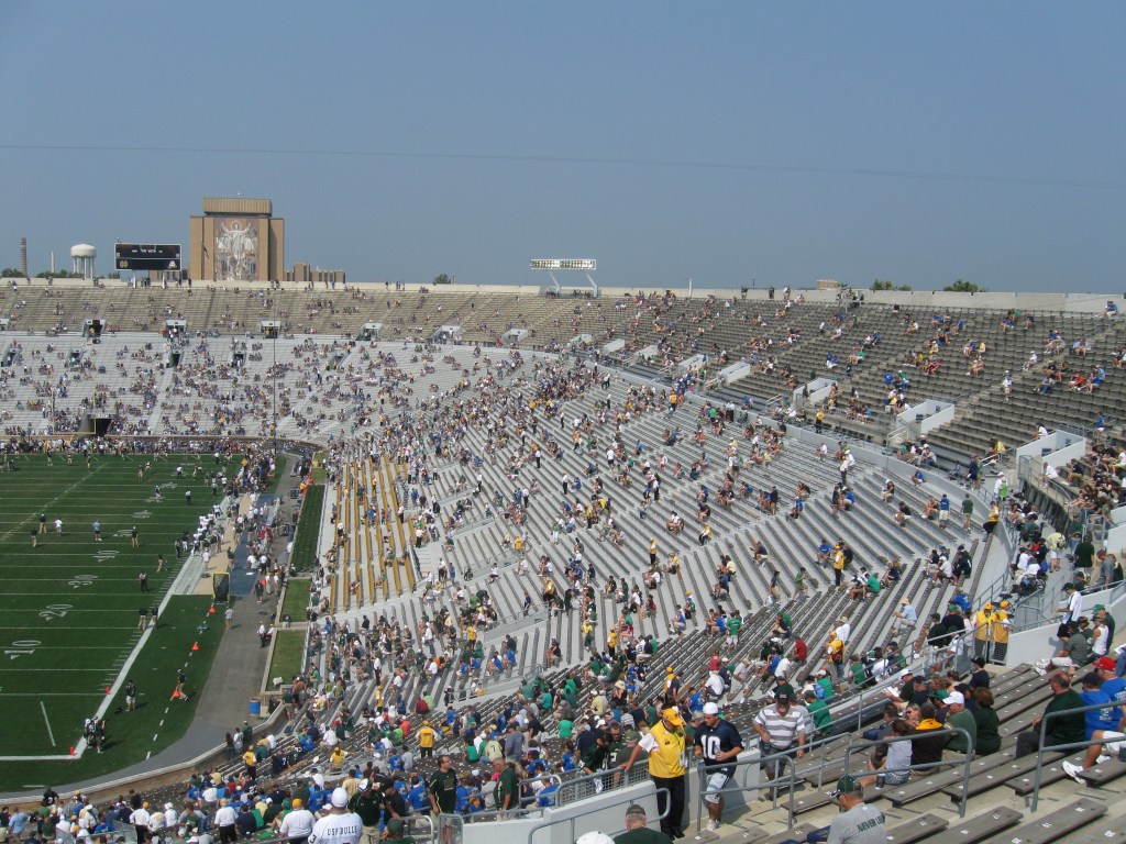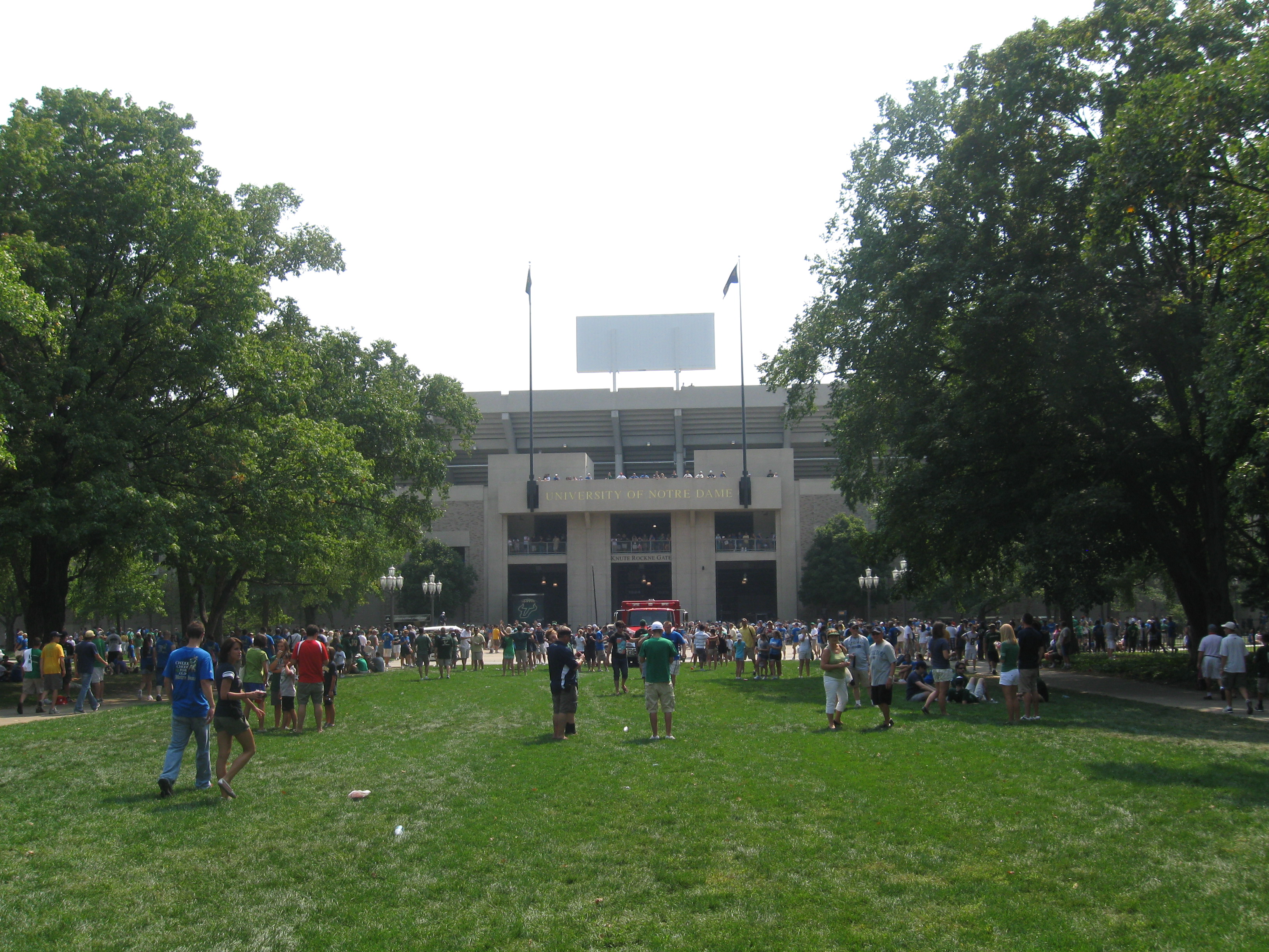 One of the most storied places in all of sports is Notre Dame Stadium and we were lucky enough to be in town for a wedding, with the game being able to fit into the schedule. This also was a milestone stadium (#100) for me and even a lengthy lightning delay in the middle of the game could not ruin this experience. The University of Notre Dame is located just north of South Bend, the fourth largest city in Indiana, home to around 100,000. It is a fully functioning city without the school, but of course when you hear South Bend, Notre Dame is the first thought that pops into your head. It is a devoutly catholic school, which is evident while strolling campus and it is a school highly ranked and strong on academics. Fighting Irish football is the main focus of a strong athletic program (they also have one of the best intramural programs in the country). Eight National Championships, seven Heisman Trophy winners and 96 All-American’s put the Irish with the bluebloods of the sport. Their last title came in 1988 with Lou Holtz as coach and though they’ve seen varied success over the last two decades, it has been quite a while since they had a legitimate chance at a National Title (which is the main goal as they do not play in a conference). Since 1930, they have played at Notre Dame Stadium, an amazing old-school, no-frills facility that allows for history and traditions to be the main part of the experience.