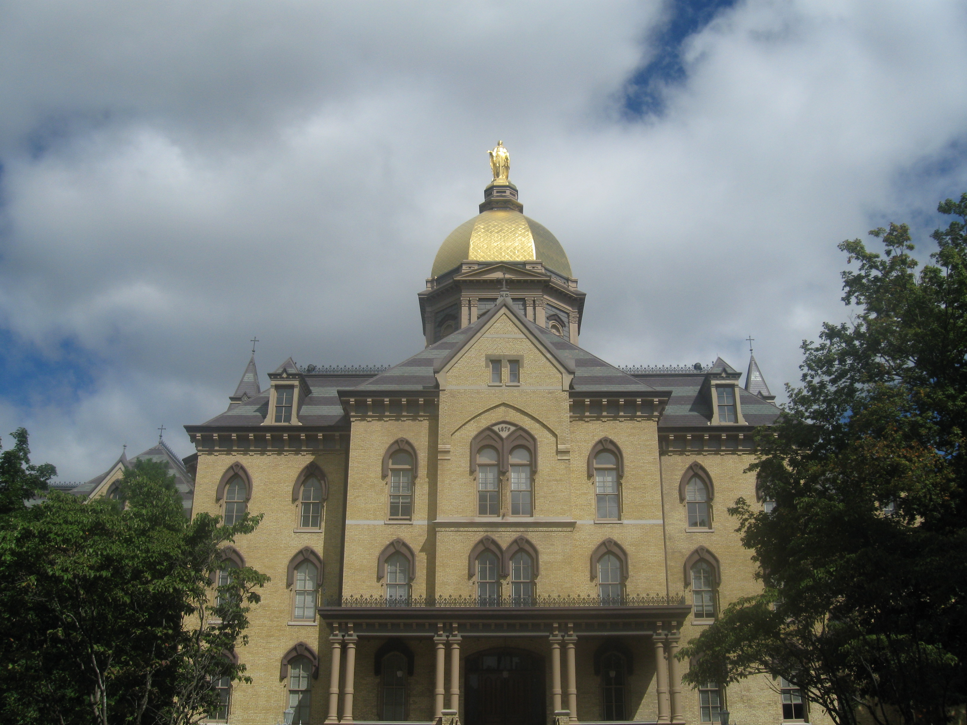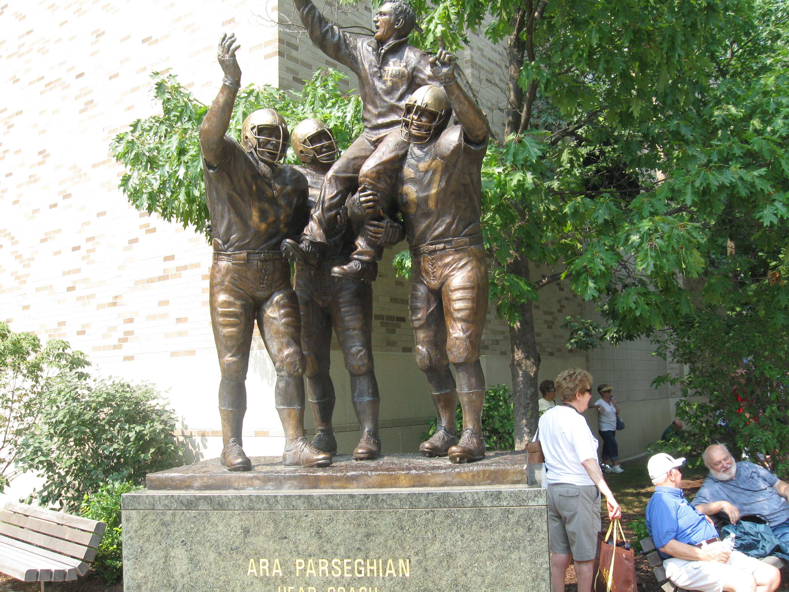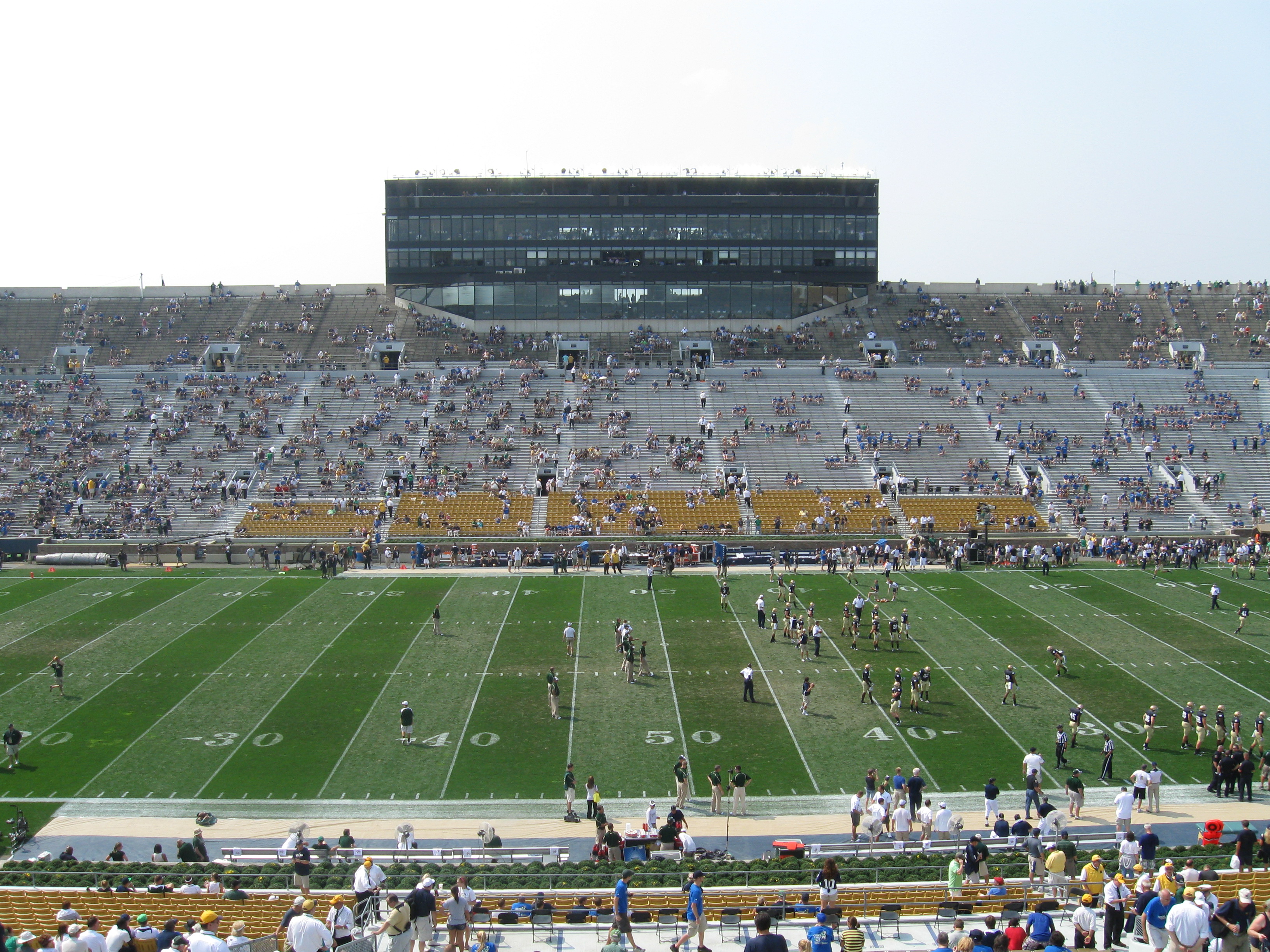 One of the most storied places in all of sports is Notre Dame Stadium and we were lucky enough to be in town for a wedding, with the game being able to fit into the schedule. This also was a milestone stadium (#100) for me and even a lengthy lightning delay in the middle of the game could not ruin this experience. The University of Notre Dame is located just north of South Bend, the fourth largest city in Indiana, home to around 100,000. It is a fully functioning city without the school, but of course when you hear South Bend, Notre Dame is the first thought that pops into your head. It is a devoutly catholic school, which is evident while strolling campus and it is a school highly ranked and strong on academics. Fighting Irish football is the main focus of a strong athletic program (they also have one of the best intramural programs in the country). Eight National Championships, seven Heisman Trophy winners and 96 All-American’s put the Irish with the bluebloods of the sport. Their last title came in 1988 with Lou Holtz as coach and though they’ve seen varied success over the last two decades, it has been quite a while since they had a legitimate chance at a National Title (which is the main goal as they do not play in a conference). Since 1930, they have played at Notre Dame Stadium, an amazing old-school, no-frills facility that allows for history and traditions to be the main part of the experience.