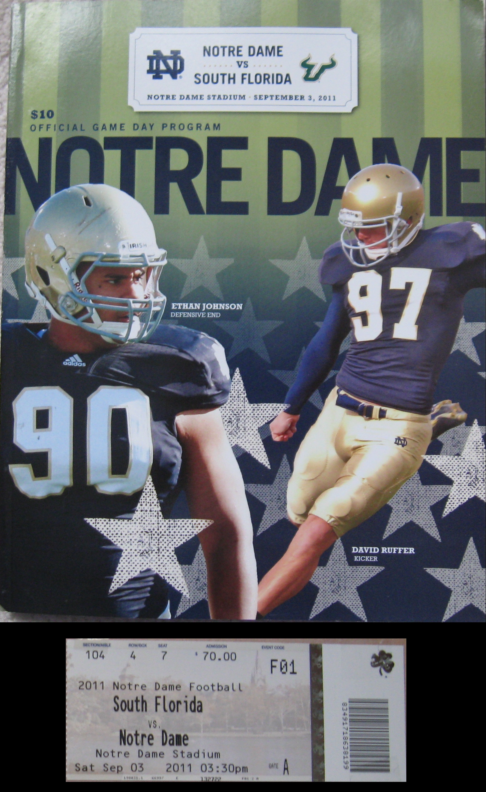This was a crazy, frustrating game. Notre Dame started with the ball and tore down field. As they were about to score an easy opening TD, Cierre Wood fumbled and USF returned it 96 yards for a touchdown. The Irish continued to stumble as a holding penalty nullified a running TD, then a few plays later the Bulls intercepted one in the end zone. South Florida went up 16-0 at a halftime that was far from uneventful. There were threats of thunderstorms all day and the first one came through at the half, which produced a lighting strike pretty close to the stadium. We had to wait two hours as fans were evacuated into the concourses and nearby buildings until the second strong storm came through. As the second half resumed, Notre Dame got a three and out, then marched down the field again to the USF 5. Remarkably, another interception was thrown, this time by Tommy Rees as the momentum was killed. The Irish were able to get on the board with a Michael Floyd touchdown, but a missed field goal at the end of the 3rd was the dagger as South Florida got an ensuing touchdown to go up 23-7. A touchdown midway through the fourth quarter could have made it a one-possession game, but the two point conversion was missed. As if things couldn’t get worse for Irish fans, lightning started in the distance and everyone was evacuated again for another 45 minutes. South Florida went on to win 23-20 despite being outgained 508-254. The five turnovers by the Irish were what decided the game. Michael Floyd had 12 catches for 154 yards and 2 TD for Notre Dame.