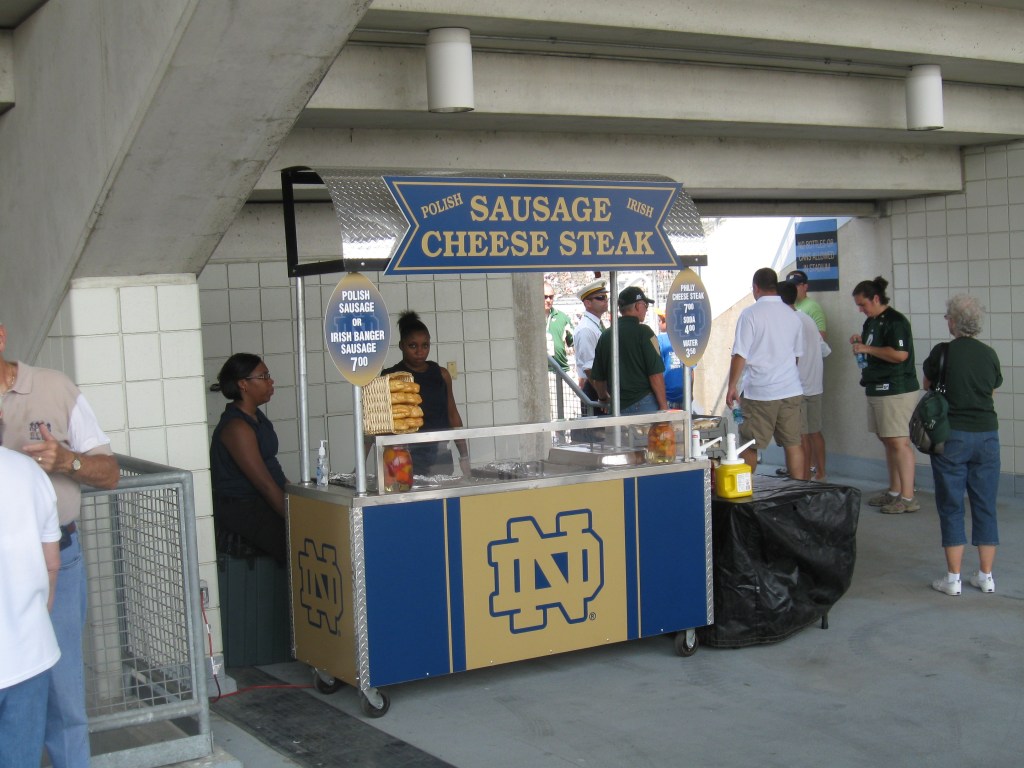Many food stands offered the usual stadium dreck including pizza, hot dogs and nachos. Variability could be found in periodic separate stands. Most of these were for Polish Sausage and Irish Banger Steaks. Tough to find and well worth seeking out were stations for carved turkey, corned beef and prime rib. There is even a noodle stand with other Asian foods, something I did not expect to see at Notre Dame. Alcohol is not served on campus.