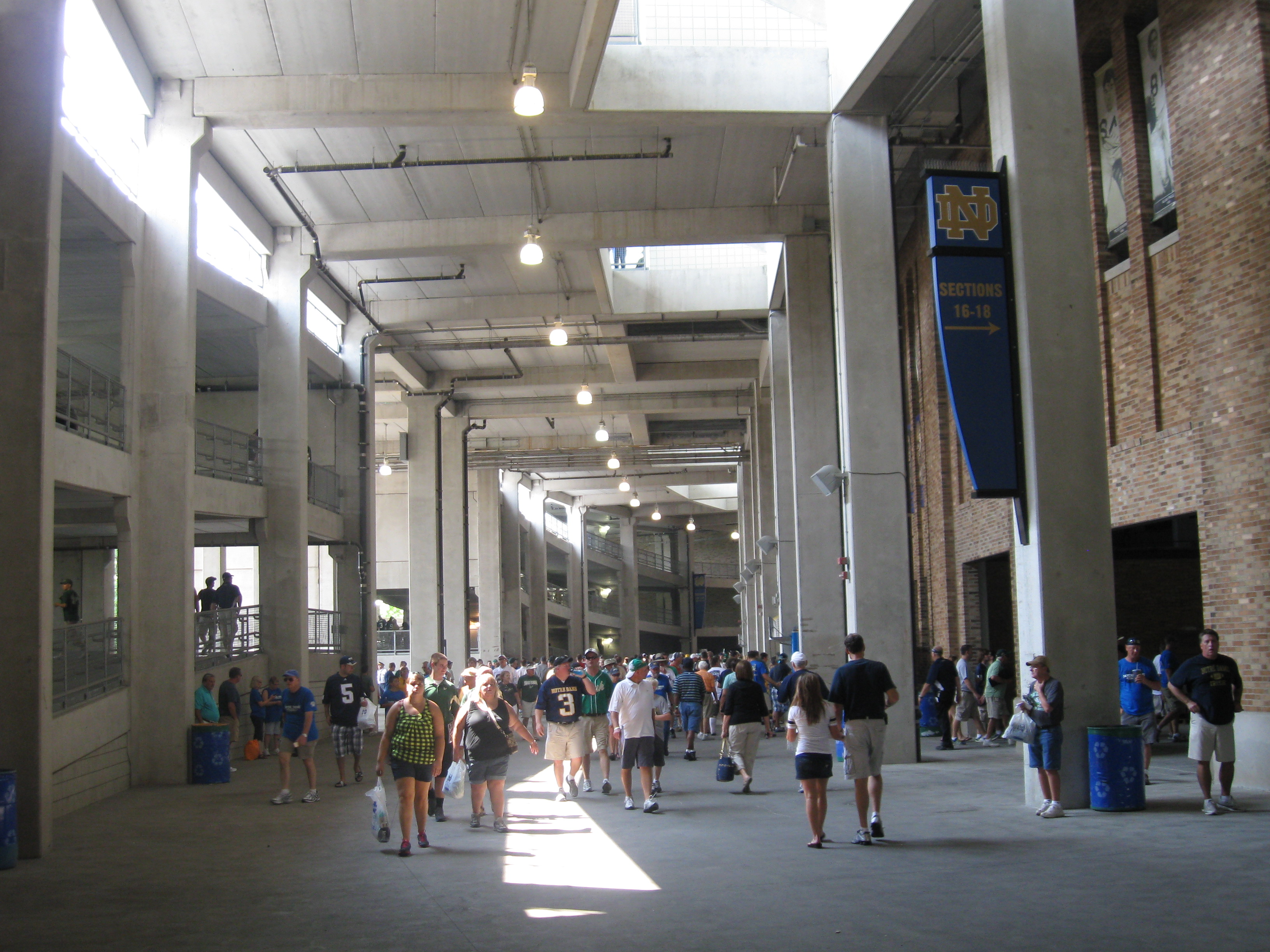 The tan-colored exterior is a mix of brick and concrete as it has an oval appearance with four separate gates. Each end has “University of Notre Dame” embedded in gold letters on the stadium. The look and material used for the exterior is consistent with most of the buildings on campus making for a great introduction to the stadium.