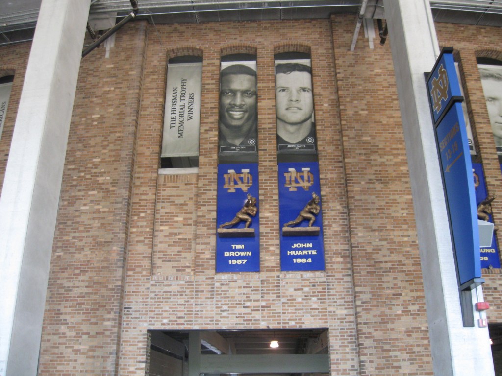 Each gate is named after a Notre Dame coach (Knute Rockne, Ara Parseghian, Frank Leahy and Lou Holtz), along with a bronze statue on the outside. The statues are well-done. Inside, I always like to see banners that are visible from the playing field and though that is unfortunately not done at Notre Dame Stadium, the banners in the concourse make up for it. Everything was displayed in an informative, skinny vertical fashion on the brick inside wall of the first level concourse. Blue National Championship banners feature the year won, along with a game schedule and big ring underneath it (there are also more traditional championship banners displayed as teams enter the tunnel). Heisman Trophy winners have their picture and a replica Heisman statue. Those Irish players that went on to the Pro Football Hall of Fame are similarly honored with a bronze, Canton-like bust under their name. Lastly, Notre Dame’s All-American’s have a black and white poster/picture. The displays are good, but this is Notre Dame. More detailed history or even a museum should be here.